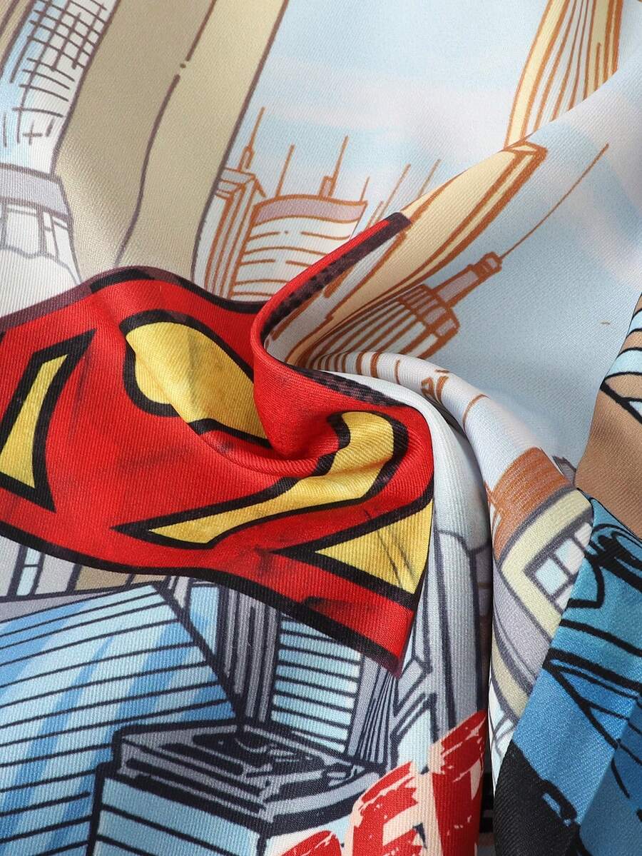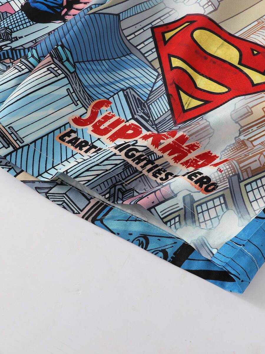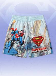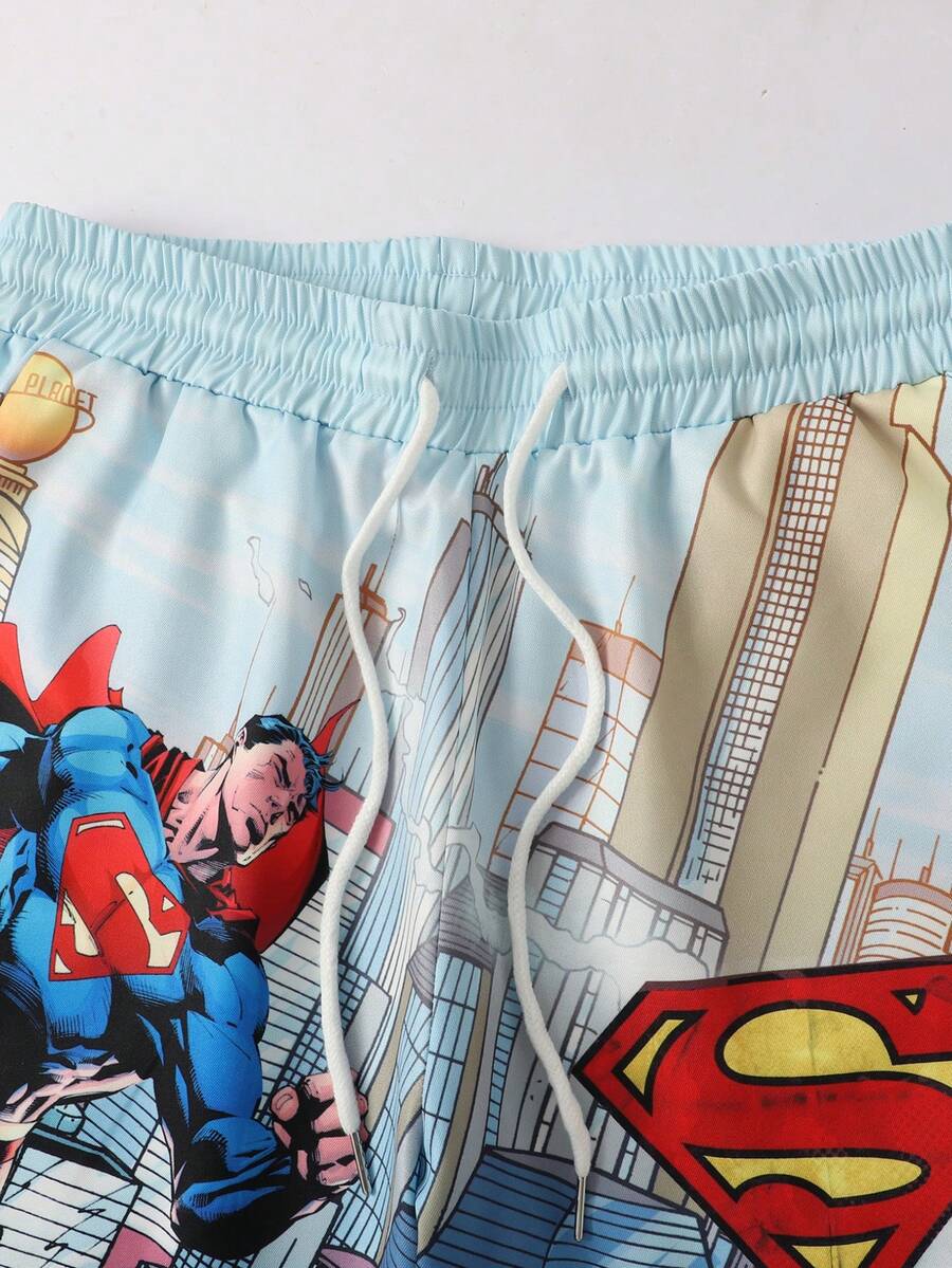 SUPERMAN X ROMWE شورت كاجوال للرجال بنقشة بورتريه وخصر بسحاب، صيفي