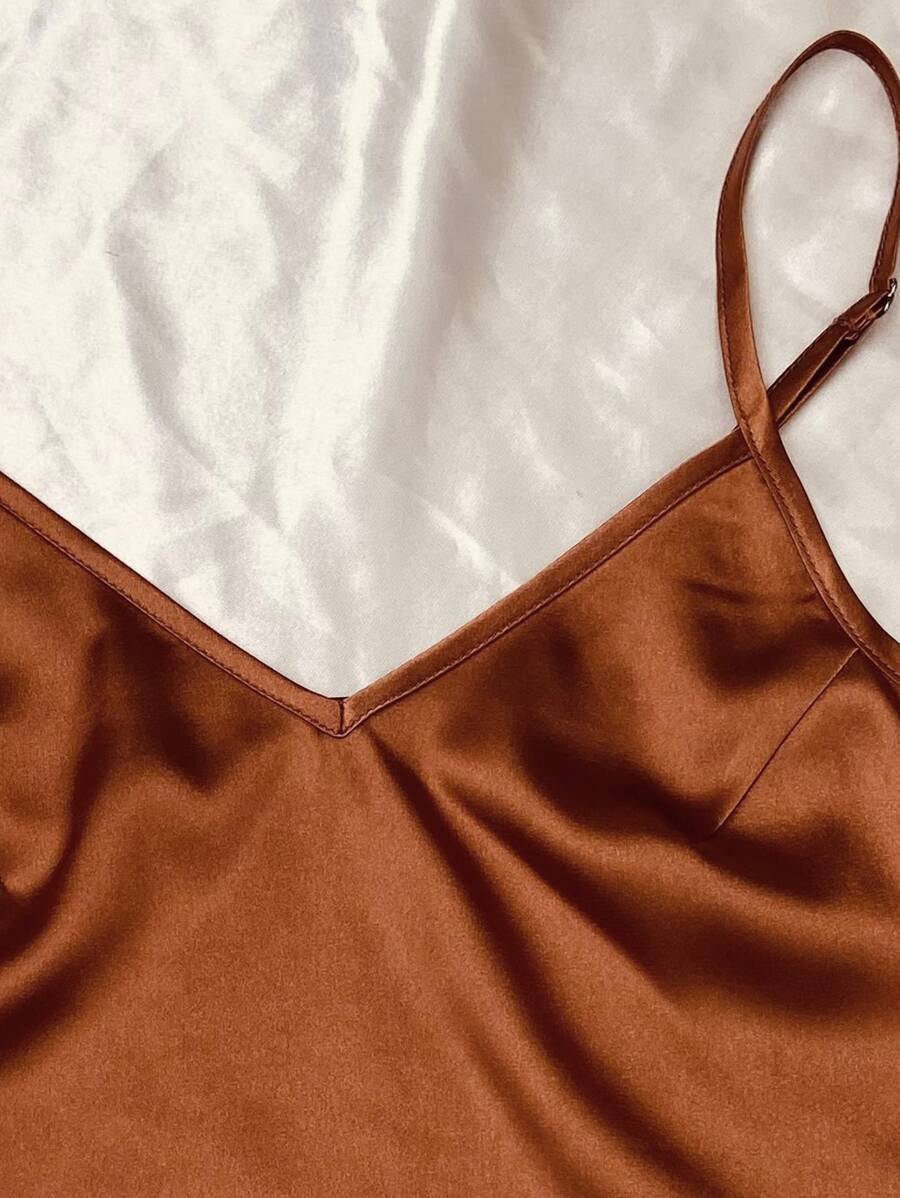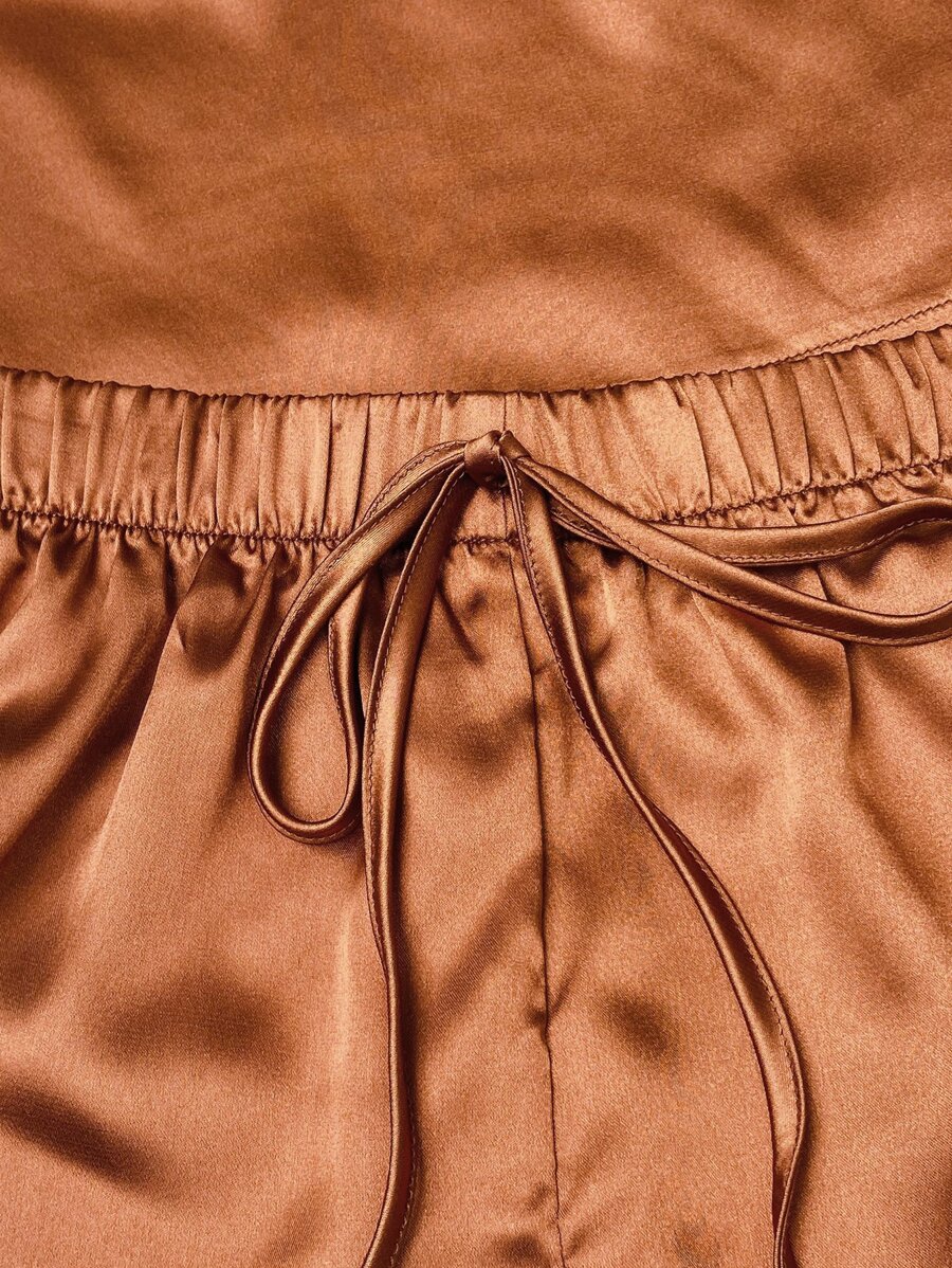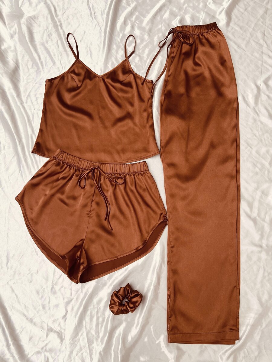 طقم بيجامة يتكون من: توب كامي من الساتان، و شورت بخصر رباط، وبنطلون، وشريطة شعر
