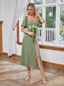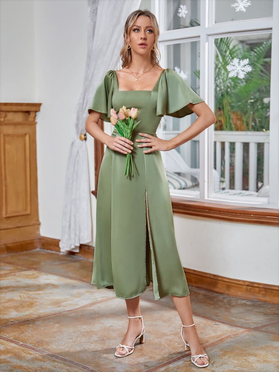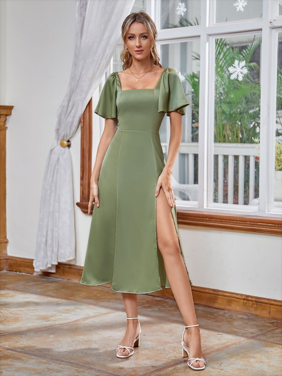 فستان بخط A مدرز وبفتحة خلفي ساتان