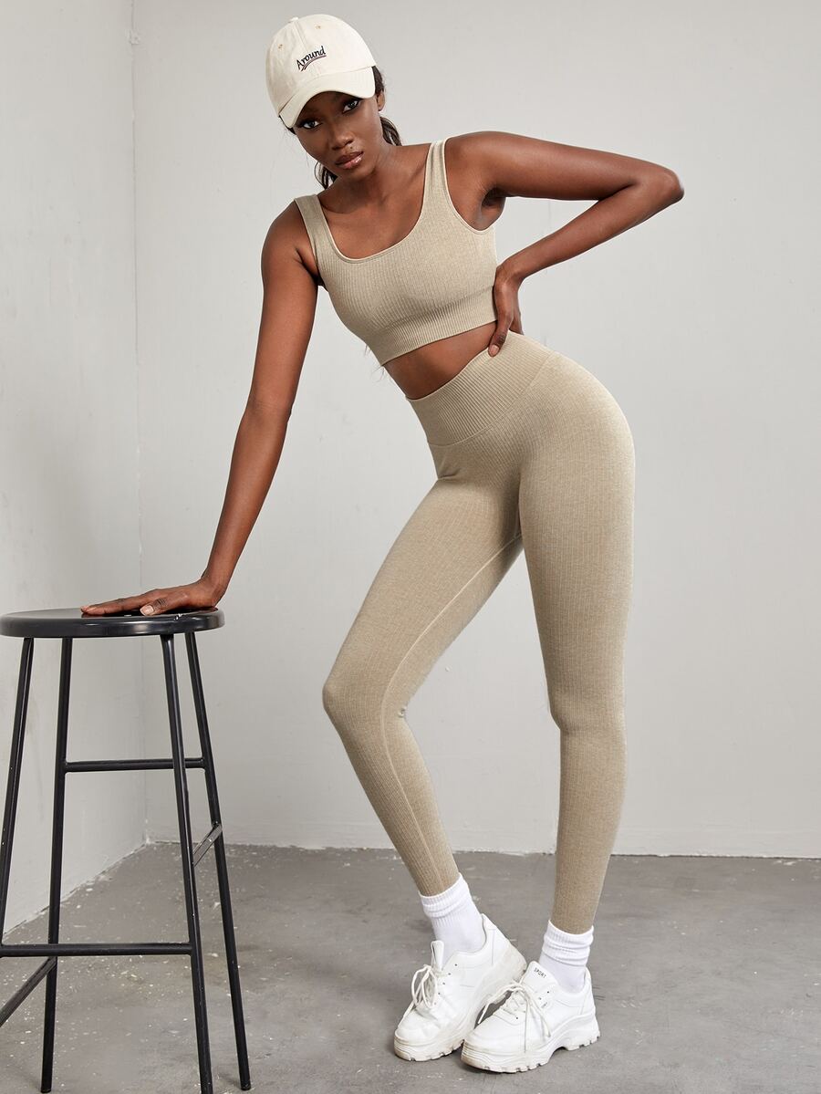 طقم ملابس رياضية نسائي يتكون من حمالة صدر رياضية مطاطية عالية الإطالة وسروال ضيق