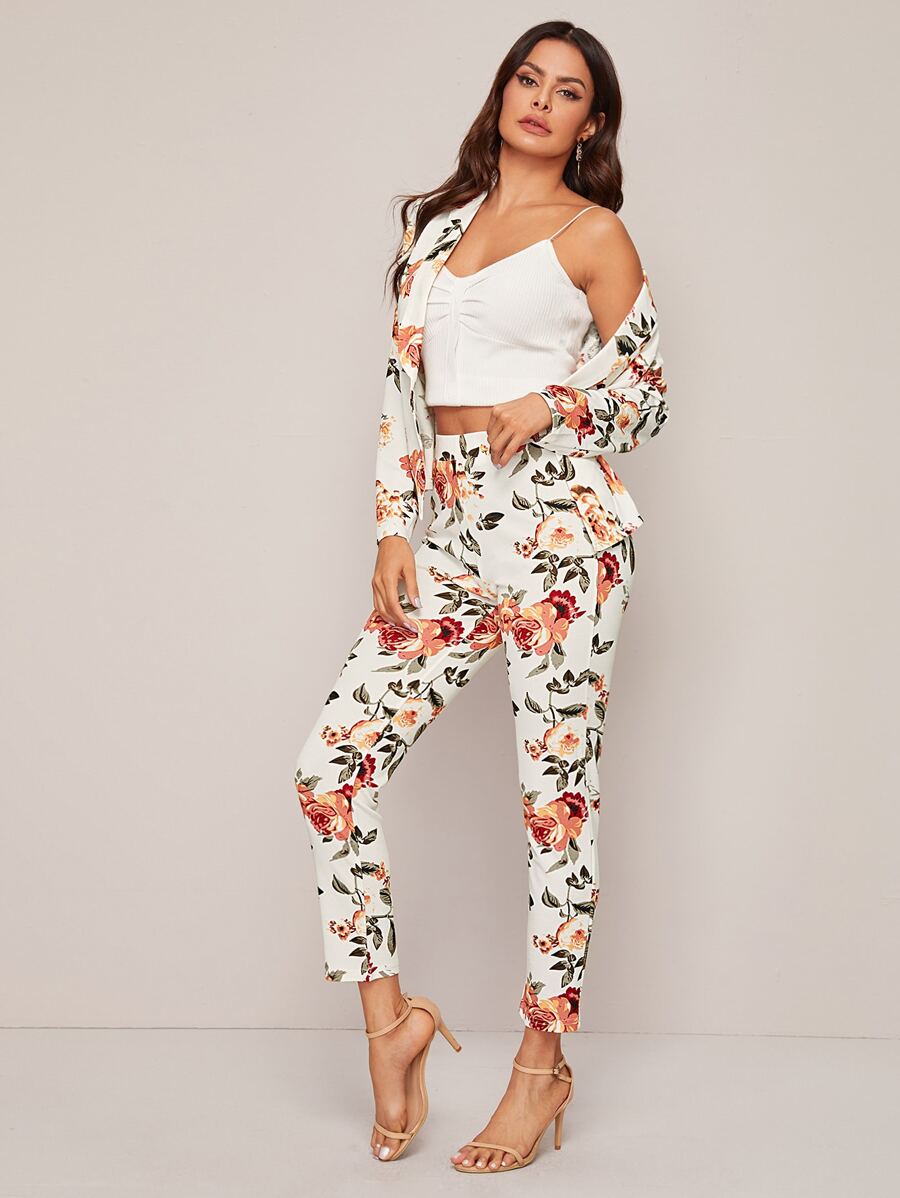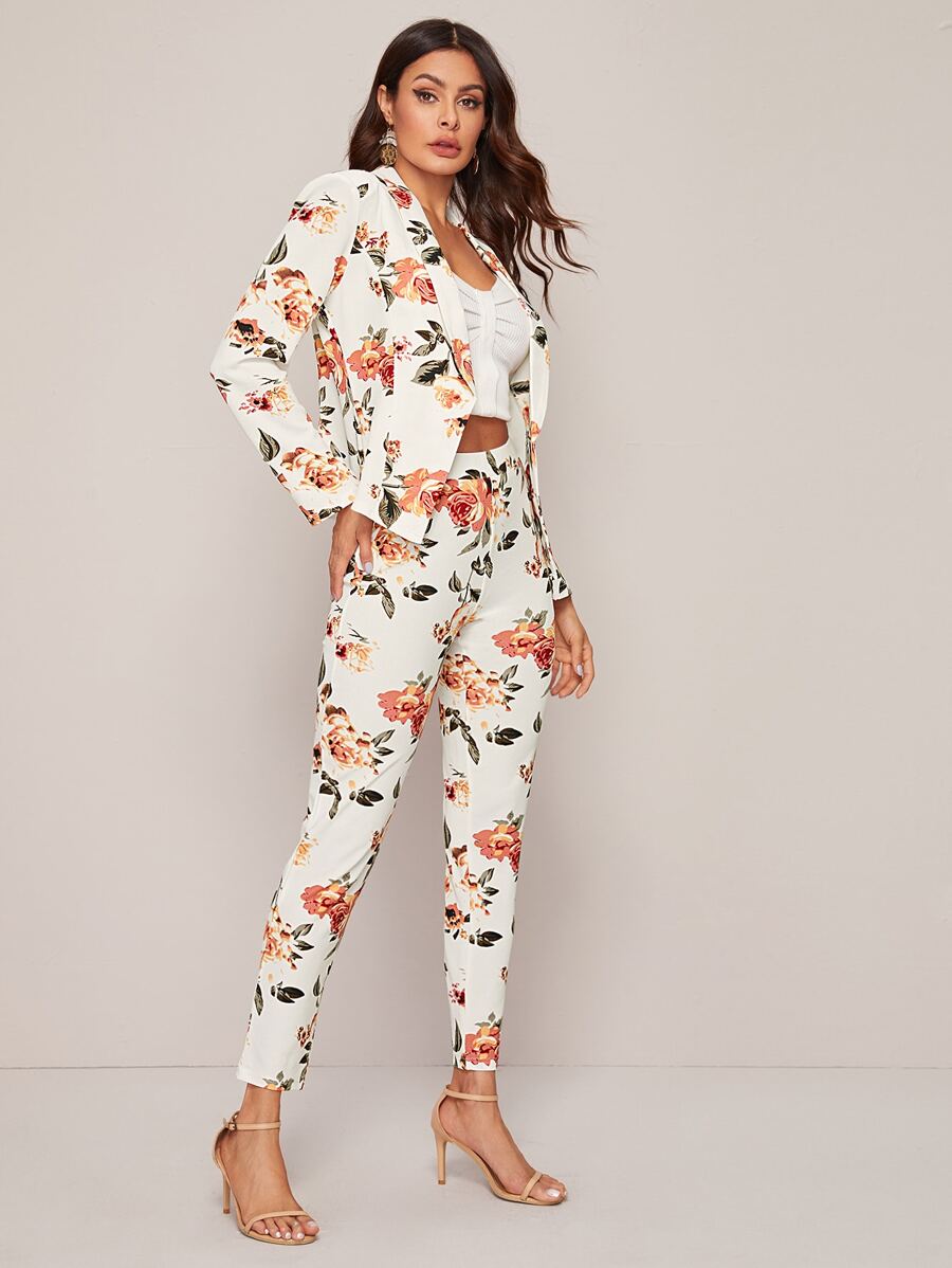 طقم سروال مع بليزر مزهر وبياقة شلال