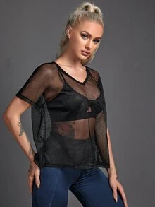 تي شيرت رياضي شبكة صيد شفاف بدون حمالة صدر