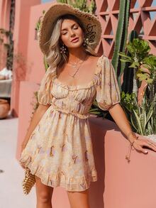 Simplee فستان بطباعة نباتية وبتفاصيل مكشكش باكمام منتفخة