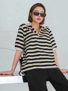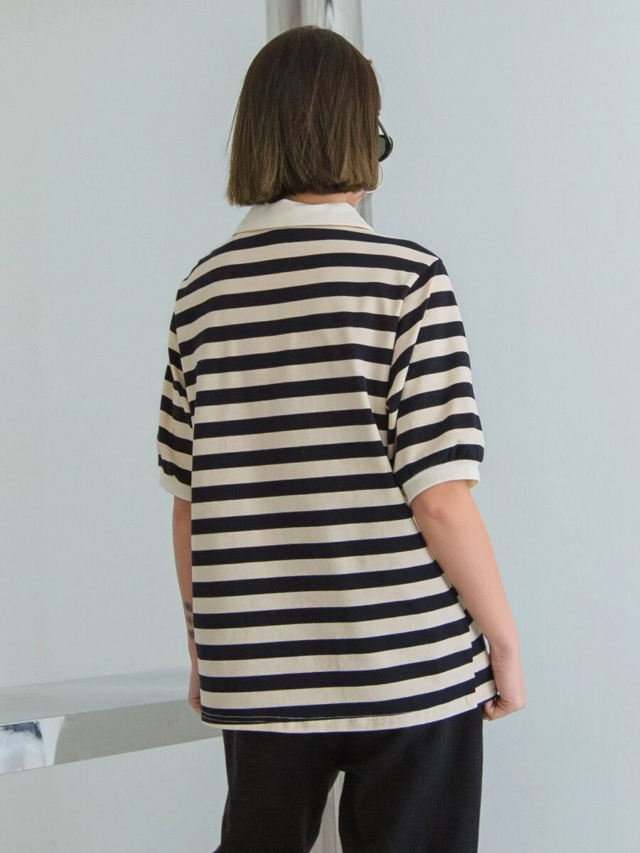 تي شيرت رسمي شريطي على الرقبة مع تطريز شعار وأكمام منتفخة