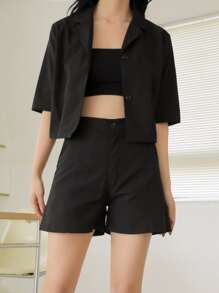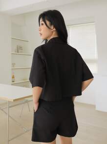 شورت مع بلوزة وبأزرار للنهاية بلون موحد