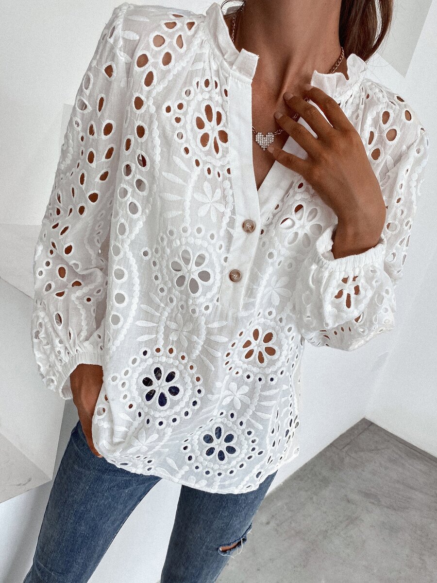 بلوزة بأزرار نصف مطرز حلقي بلون موحد
