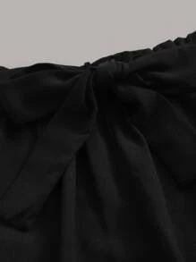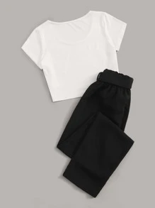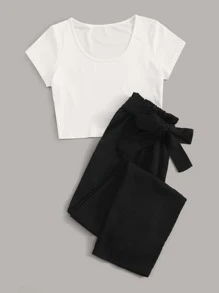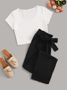 سروال بحزام مع تي شيرت بعنق مغرق وبلون موحد