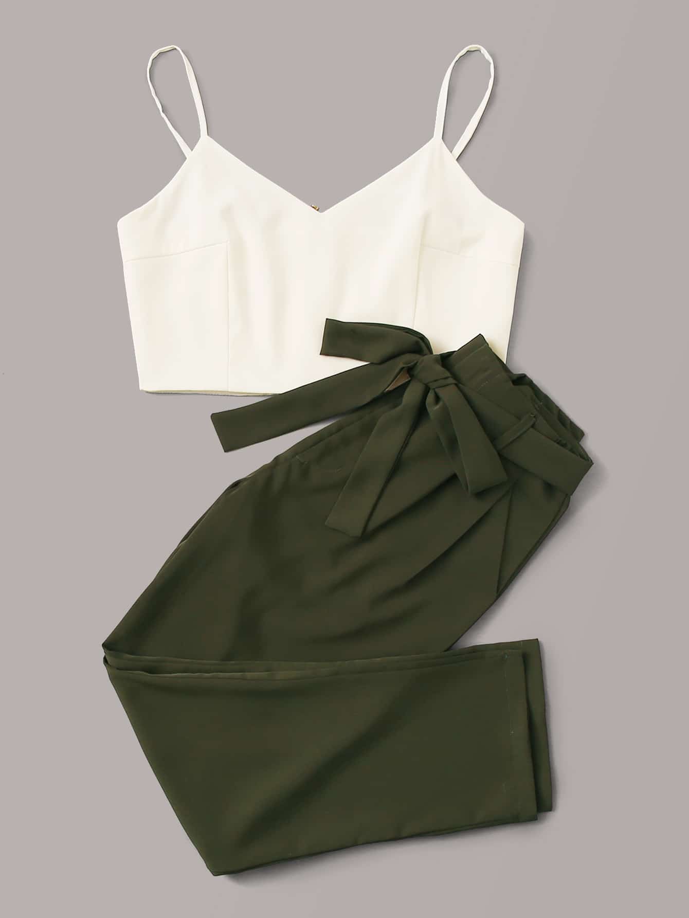 موحدة اللون عنق V صدرية كامي و حزام بنطلون