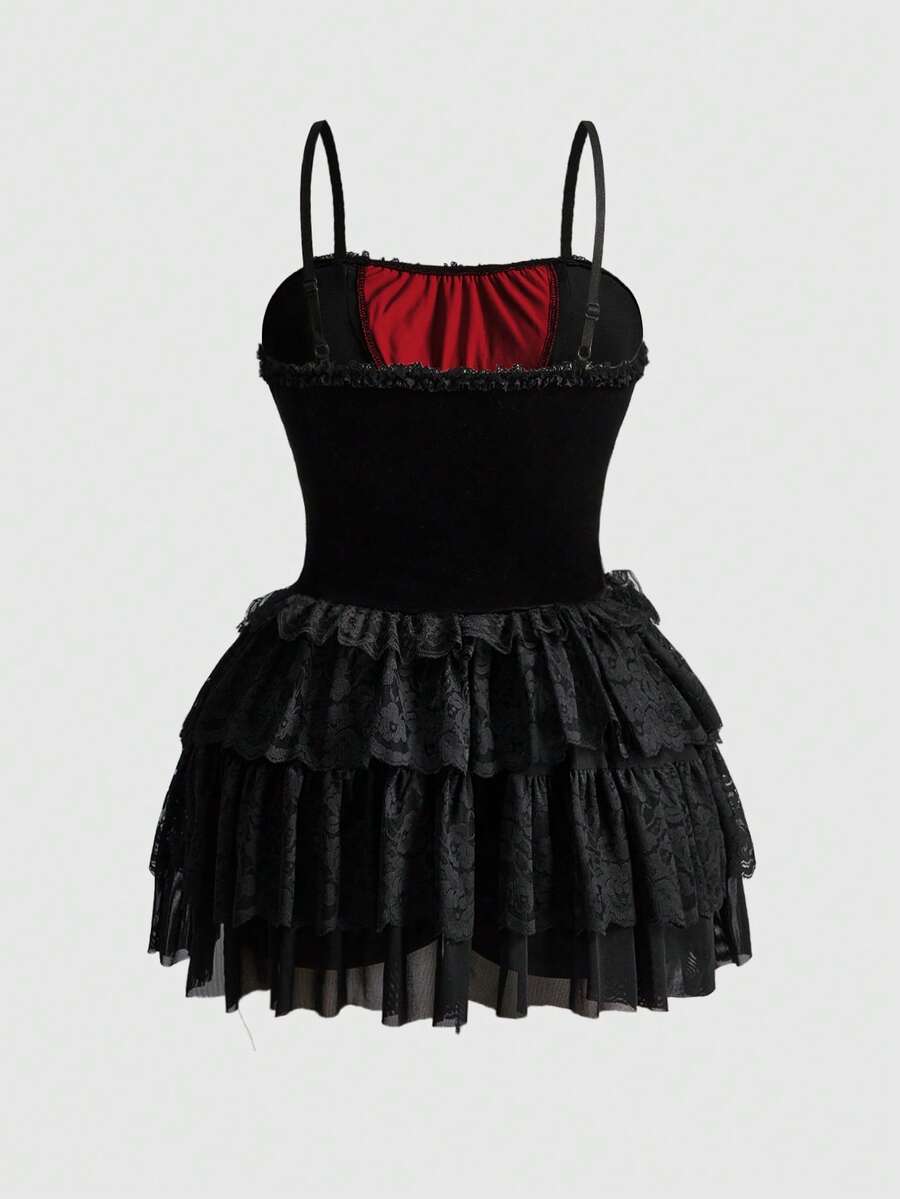 Goth فستان جوتيك فينتاج بتصميم شبكة العنكبوت من الدانتيل الأحمر والأسود، تصميم جاكارد مع حاشية إضافية للمقاسات الكبيرة، فستان جوتيك فينتاج أنيق قصير للمقاسات الكبيرة
