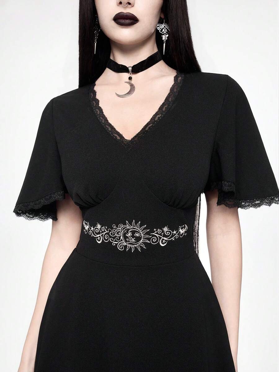 Goth فستان قصير بياقة على شكل حرف V مزين بتطريز الشمس والقمر بطراز جوتيك عتيق مع تباين الدانتيل