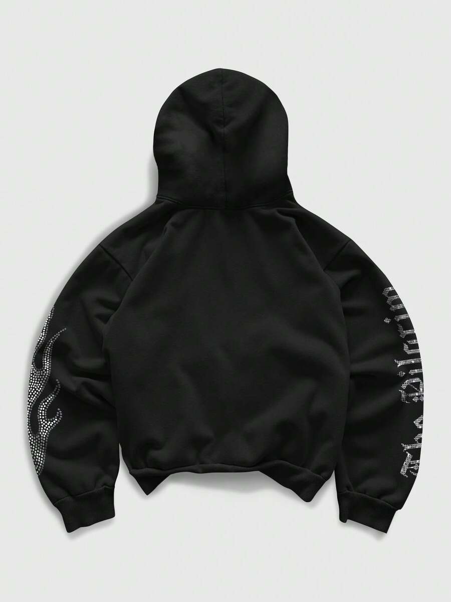 Street Life بلوفر رجالي بسحاب وغطاء للرأس مزين بحرف ولهب مرصع بالراين لفصلي الخريف والشتاء