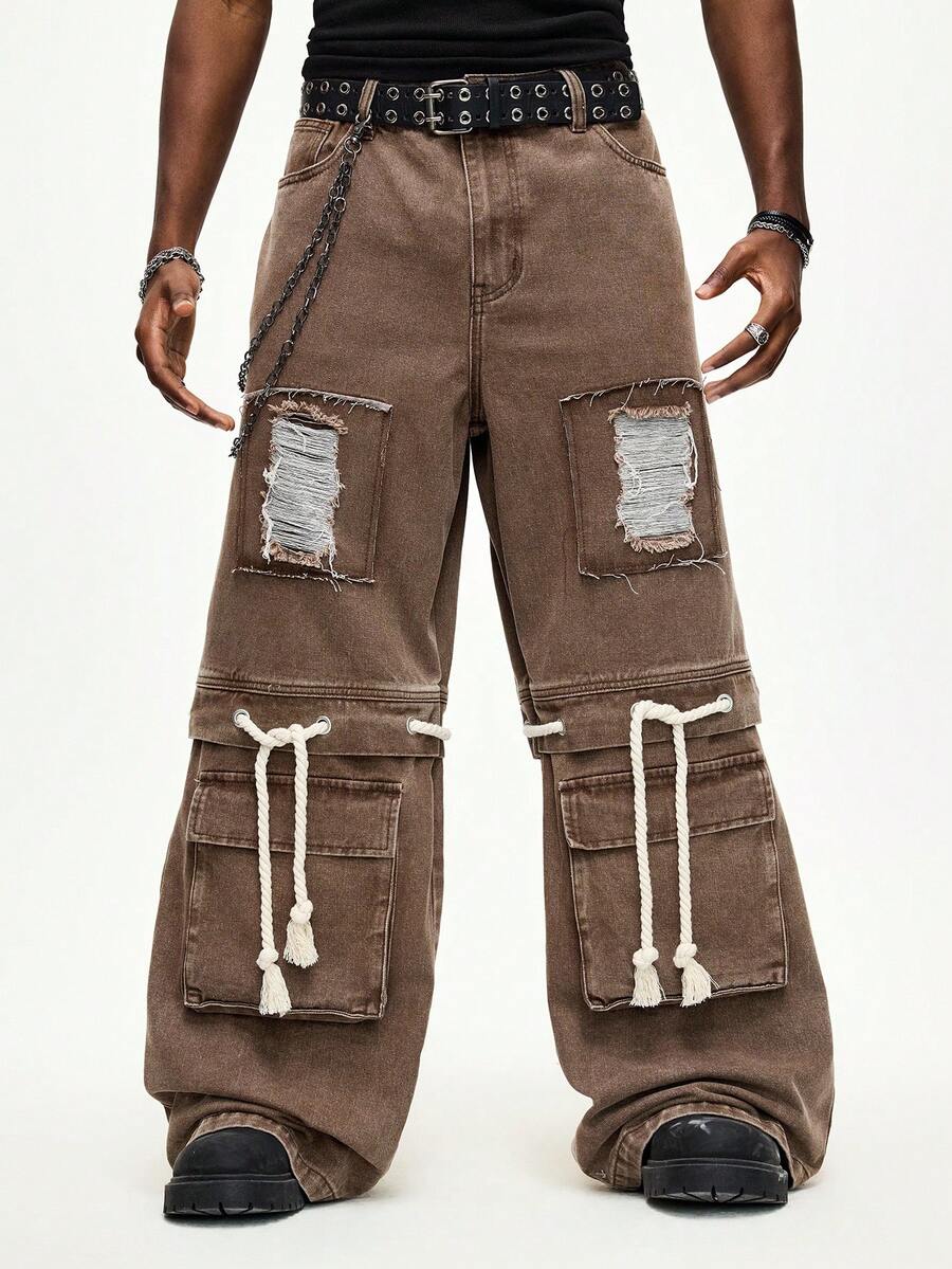 Street Life بنطلون جينز رجالي مستقيم الساق بتفاصيل بنية مشوهة