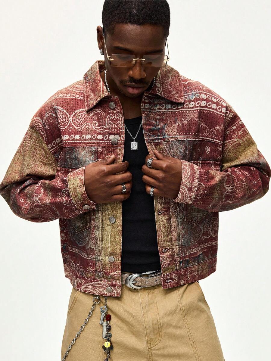 Street Life جاكيت جينز بأكمام طويلة وجيوب ذات طبعة الكاجو الرجالية الكاجوال