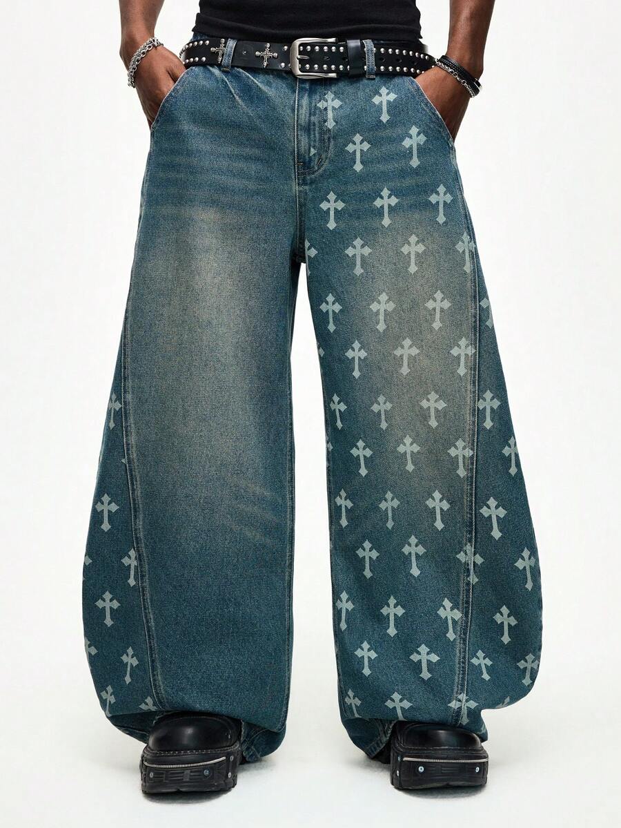 Street Life جينز كاجوال فضفاض مع جيب بنمط الصليب وحافة منحنية