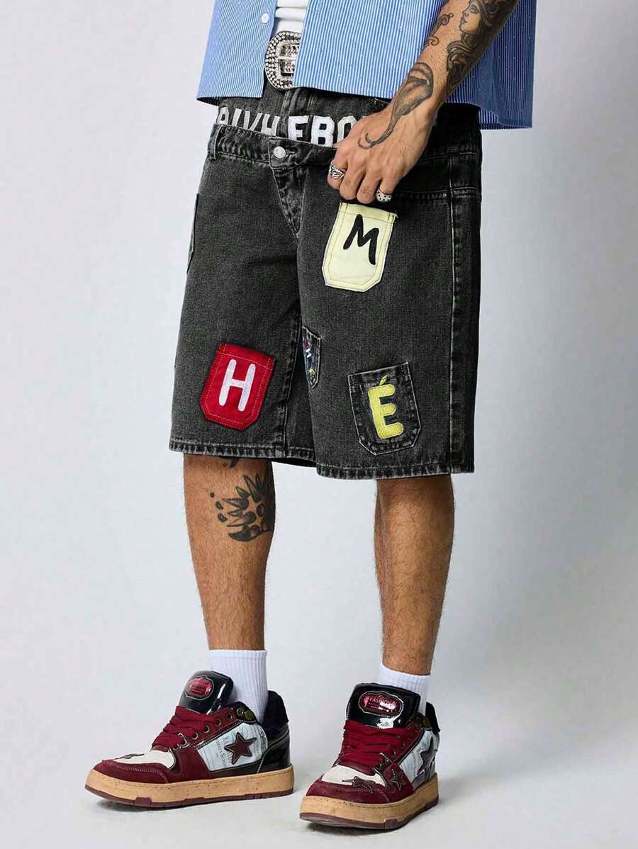 Street Life سروال جينز قصير للرجال مطرز بحزام خصر مزدوج الطبقات