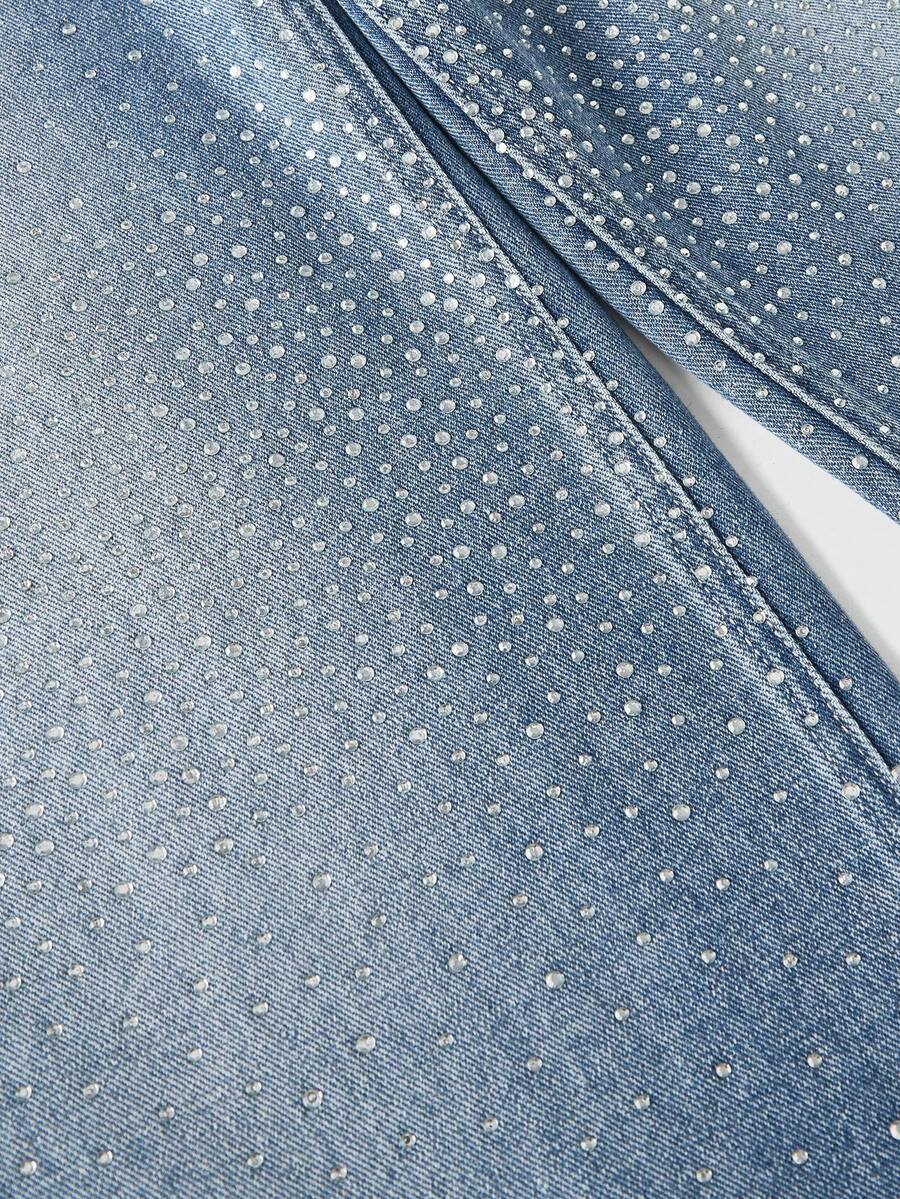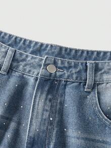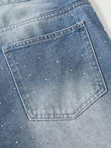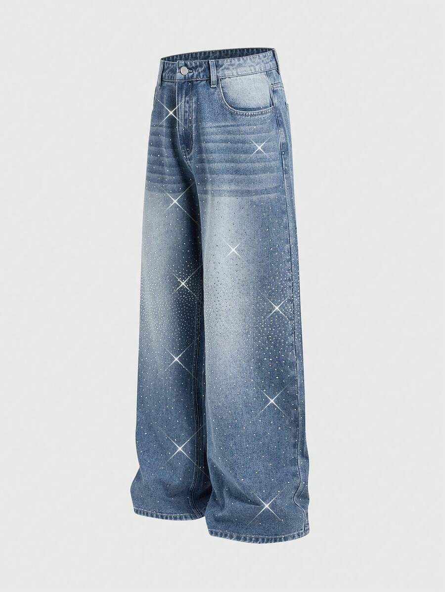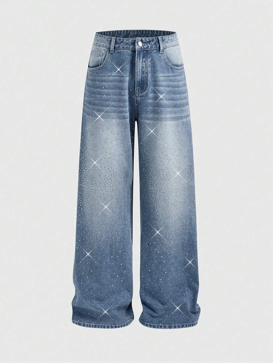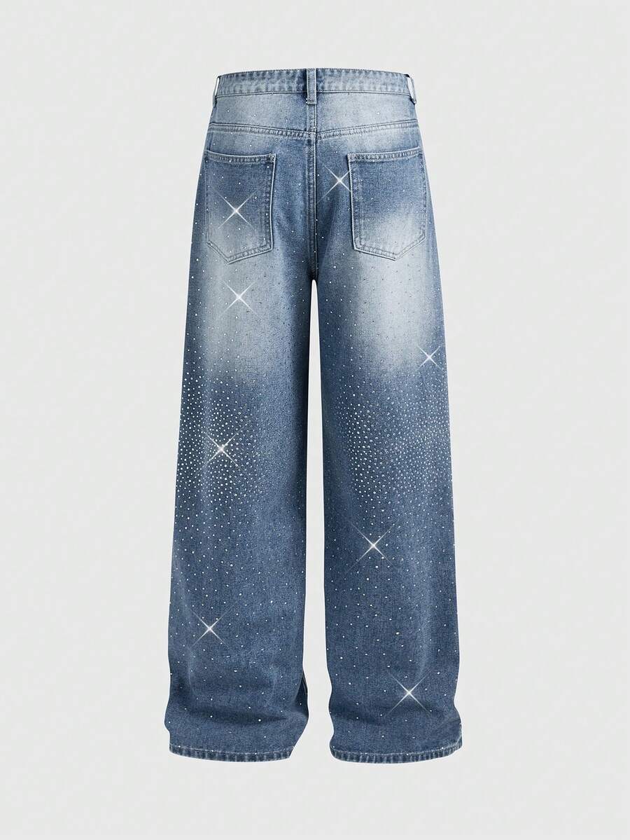 Street Life جينز فضفاض مزين بالراين ستون مع جيوب مائلة، ملابس كاجوال للاستخدام اليومي للرجال
