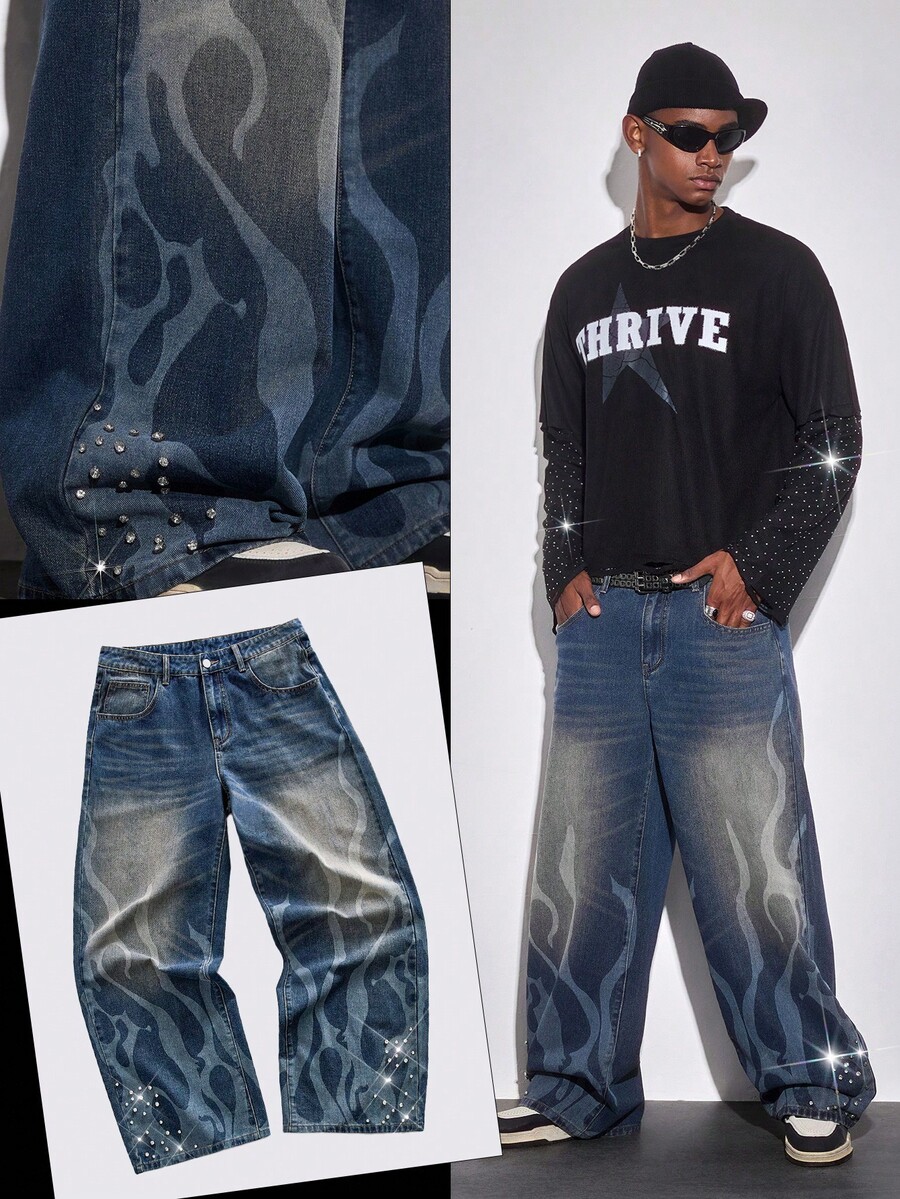 Street Life بنطلون جينز رجالي فضفاض بساق واسعة مع جيب بنمط اللهب