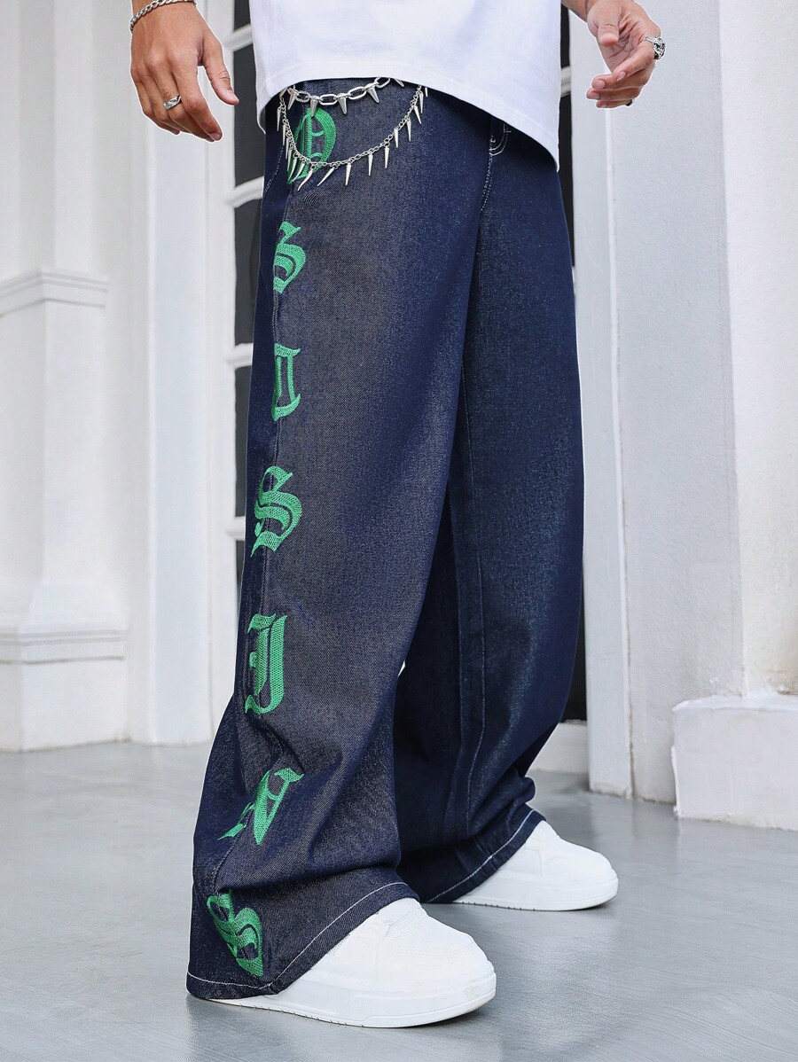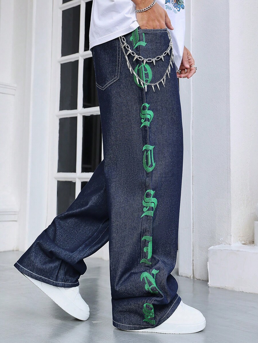Street Life سراويل جينز دينيم فضفاضة متعددة الاستخدامات مطرزة بحرف جوتيك، للرجال، للهالوين