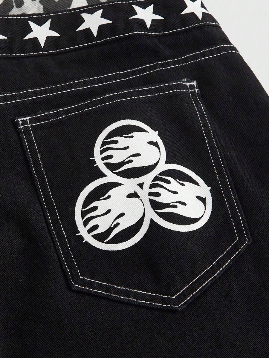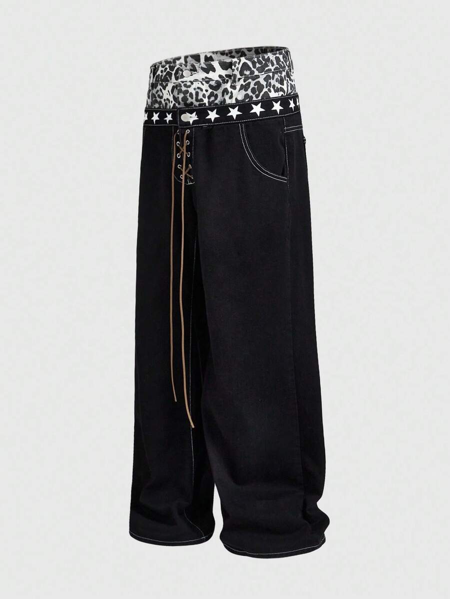 Street Life بنطلون جينز رجالي فضفاض بطبعة جلد النمر وتصميم لاصق مزدوج الخصر