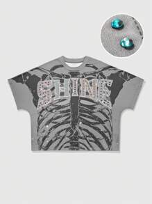 Street Life قميص تي شيرت رجالي بطباعة حرف وهيكل عظمي مرصع بالراين، كاجوال بياقة مستديرة وأكمام قصيرة، مناسب للرقص والهالوين