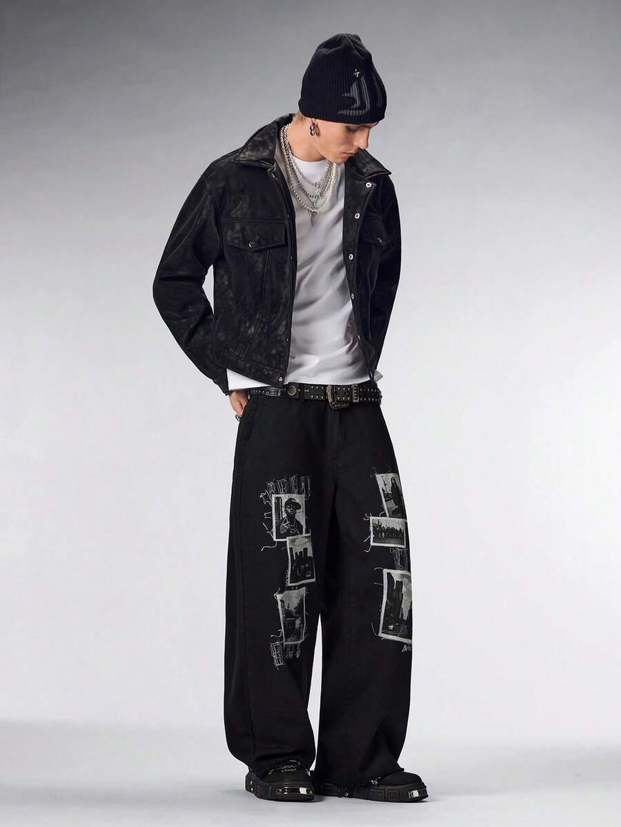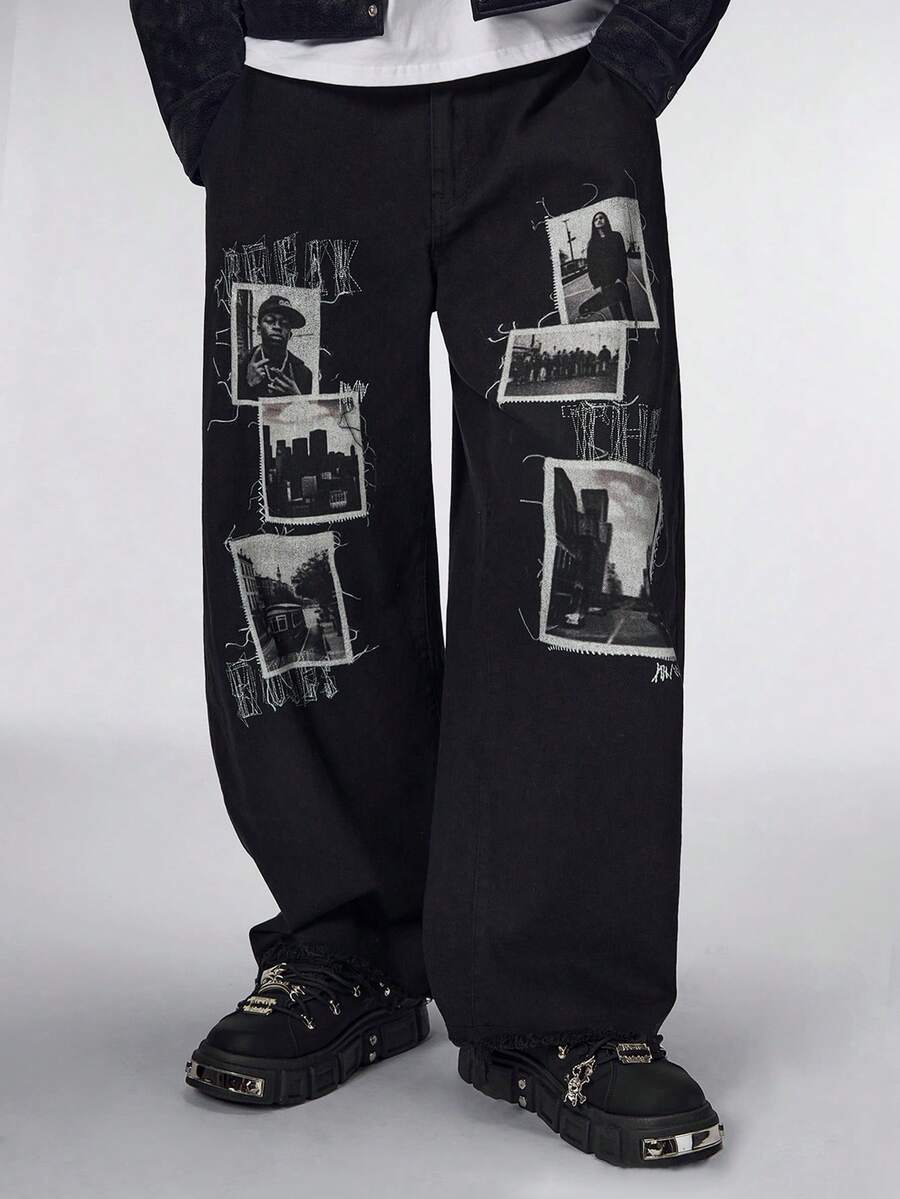 Street Life جينز رجالي مُبَهَّت مُحَمَّل بطباعة صور، غسيل داكن