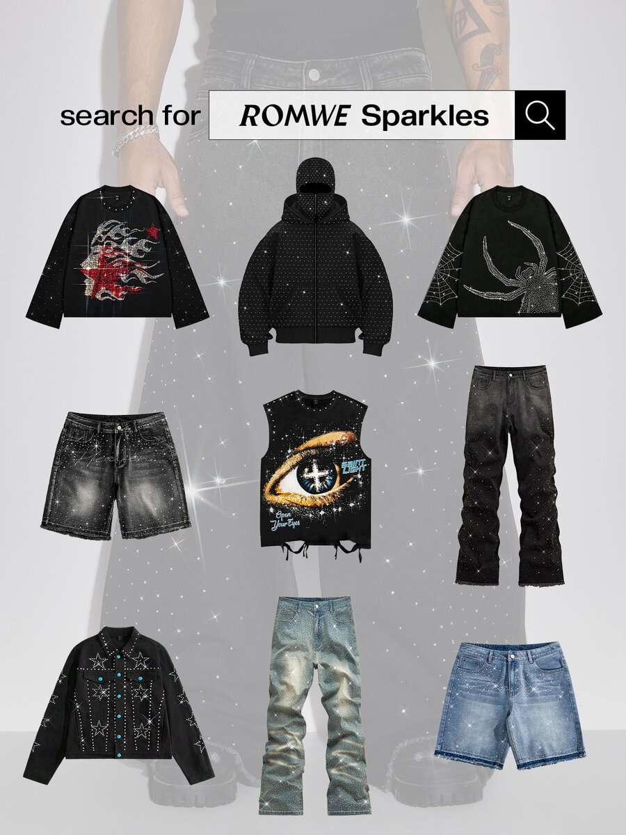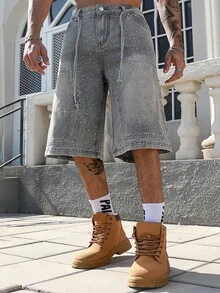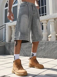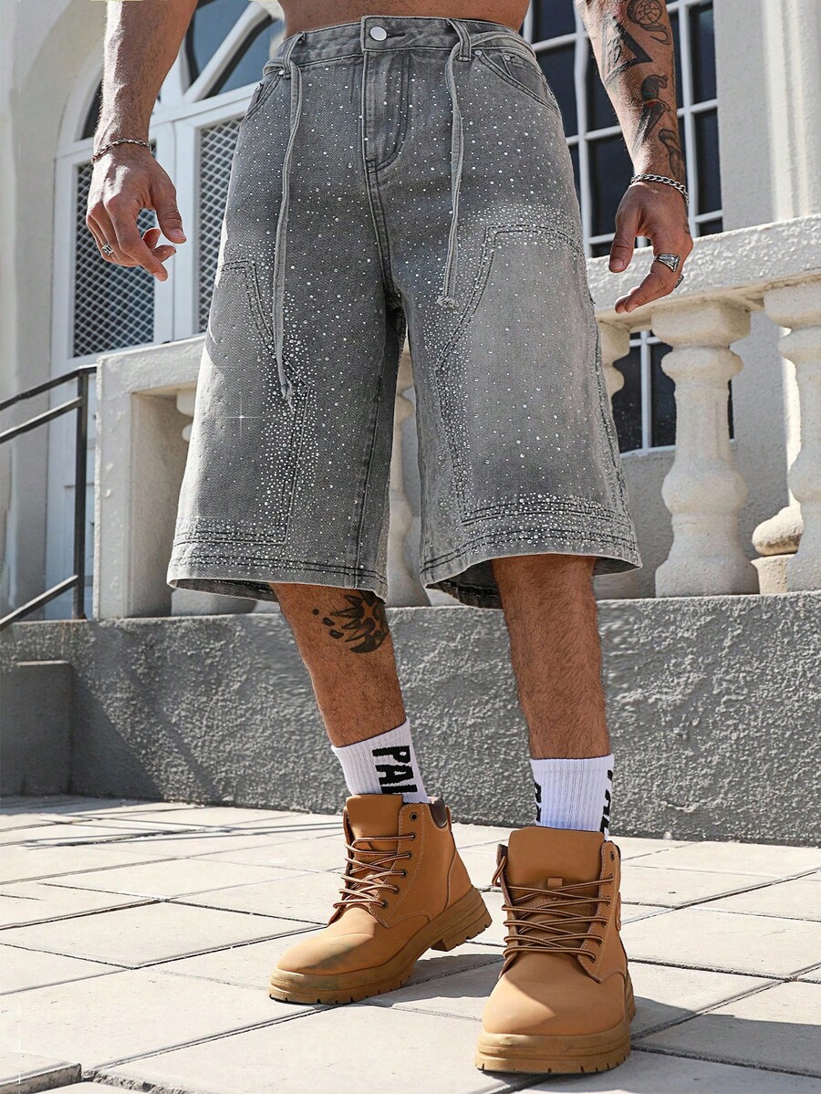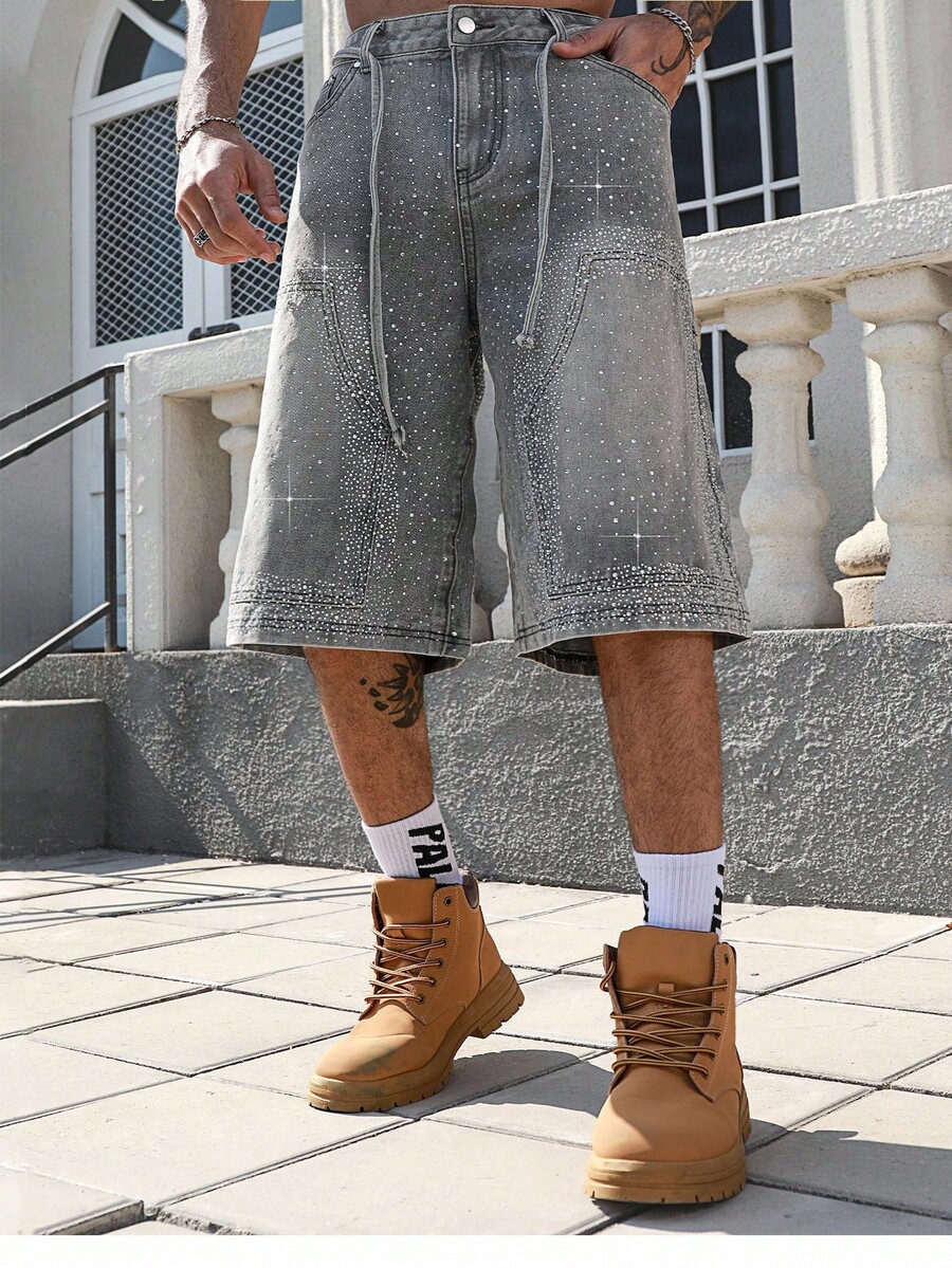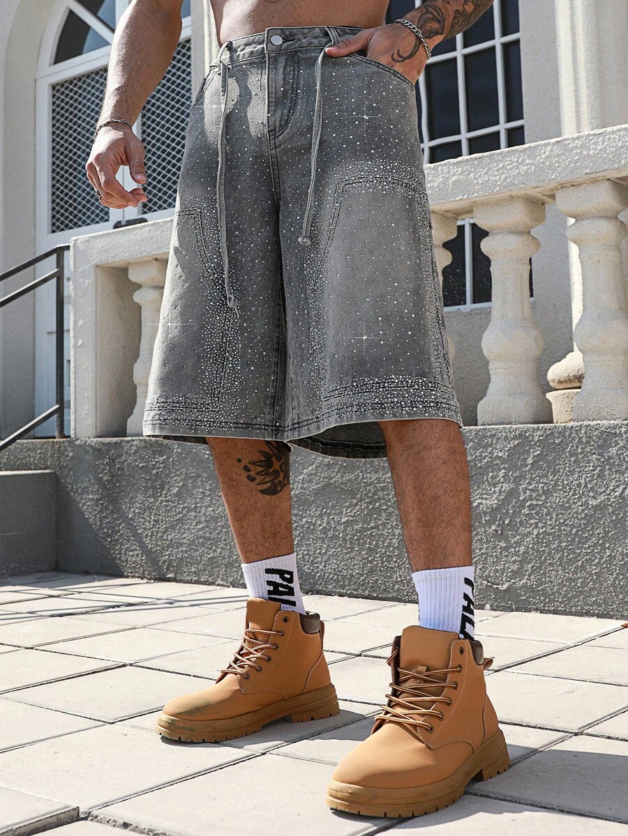 Street Life بنطال جينز واسع الساق 3/4 للرجال مزين بالرينستون اللامع