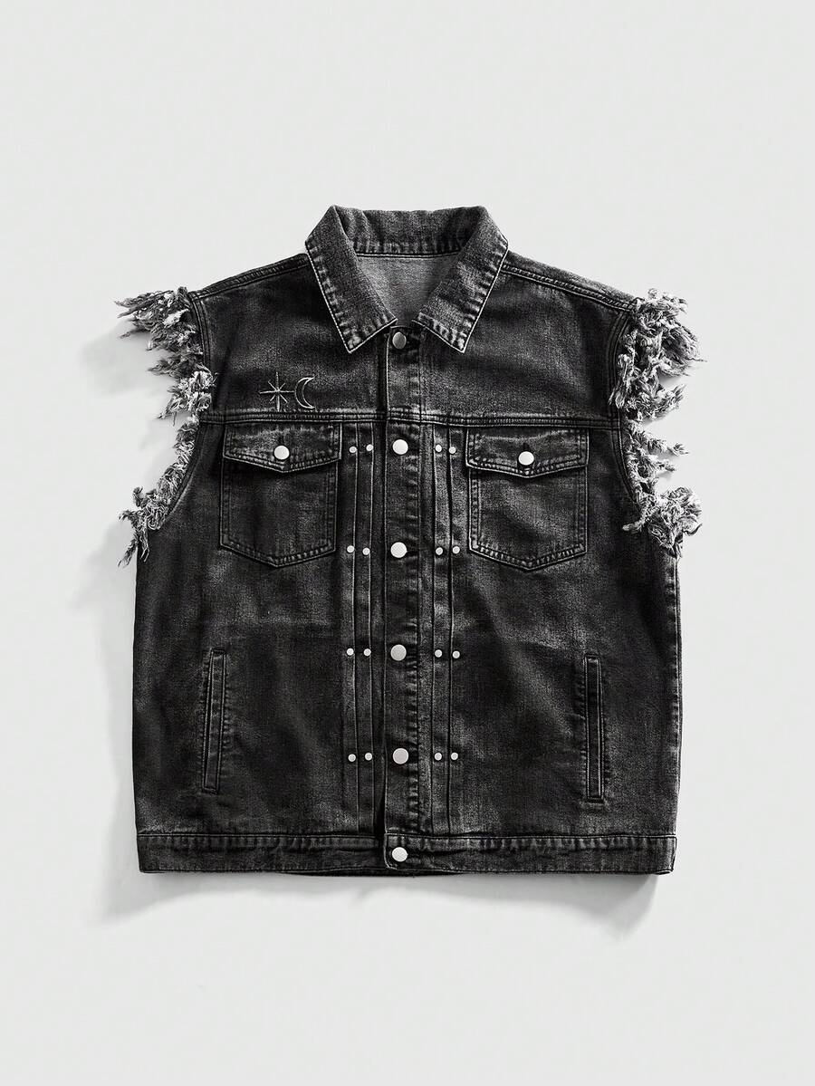 Street Life سترة جينز كاجوال للرجال بجيب واحد مطرزة بالنجوم والقمر وحافة مبهتة