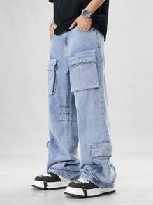 Street Life بنطلون جينز رجالي فضفاض عادي بجيوب، تصميم بسيط للاستخدام اليومي