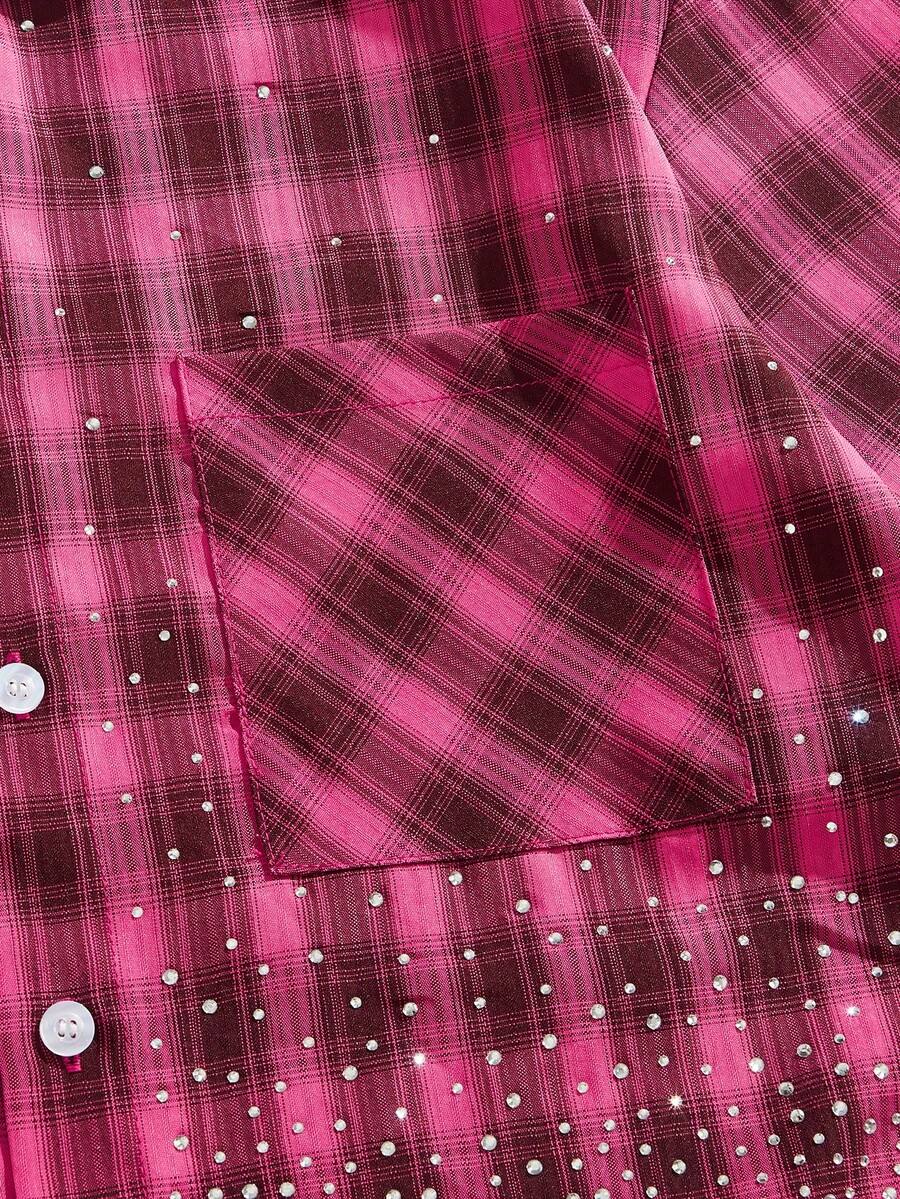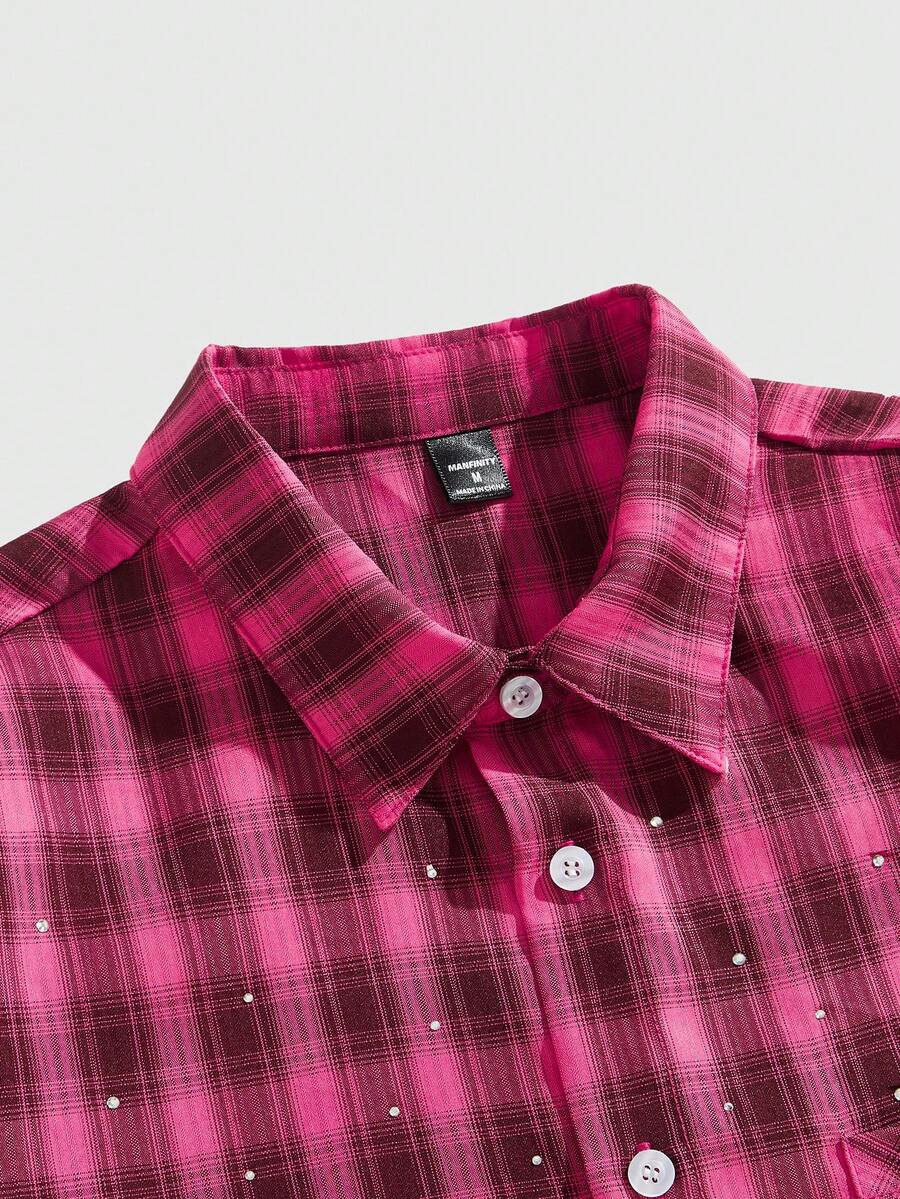 Street Life قميص رجالي أنيق بطباعة مربعات مزين بالراين ستون لفصل الصيف