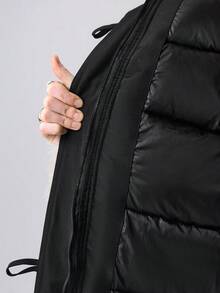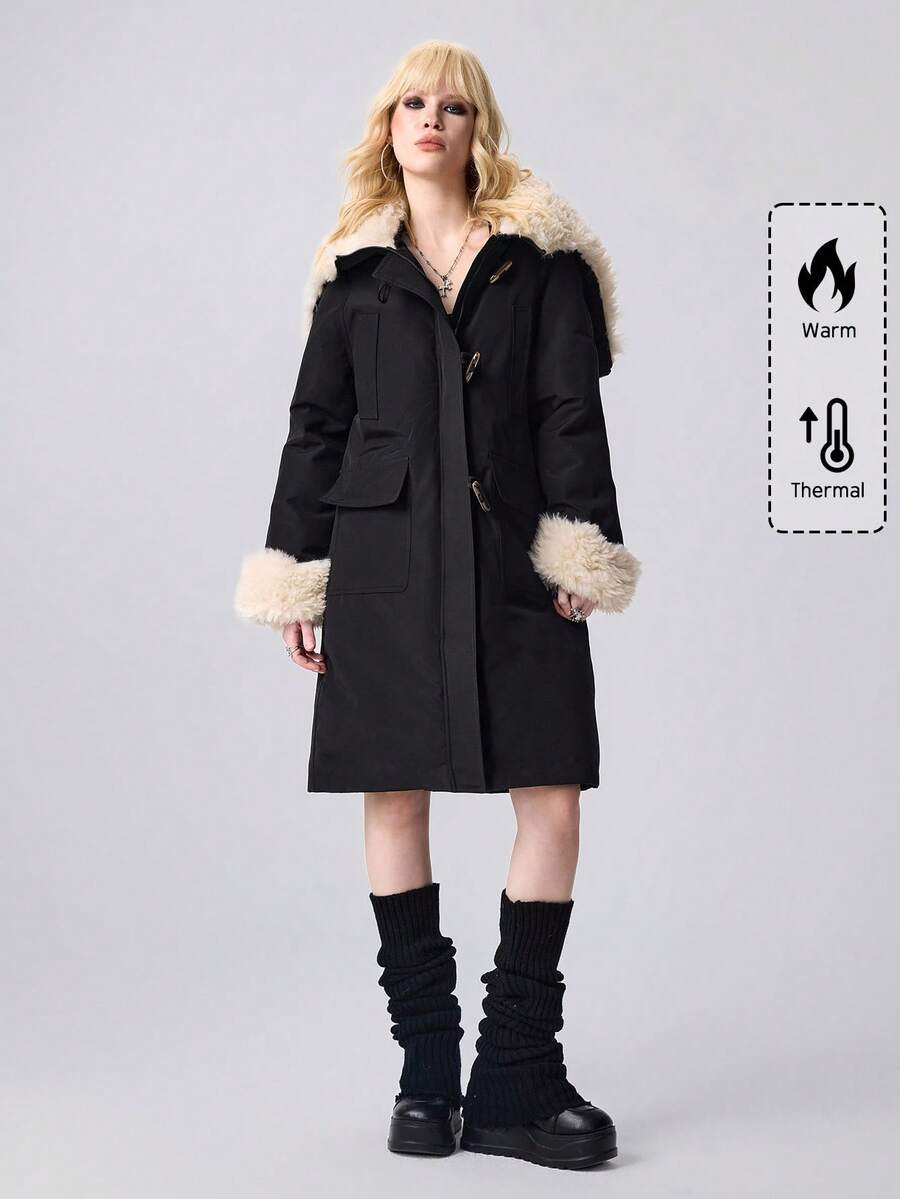 معطف مبطن بقطع من الفرو الصناعي على الطراز الكوري، طول متوسط، أزرار قرن، لون أسود