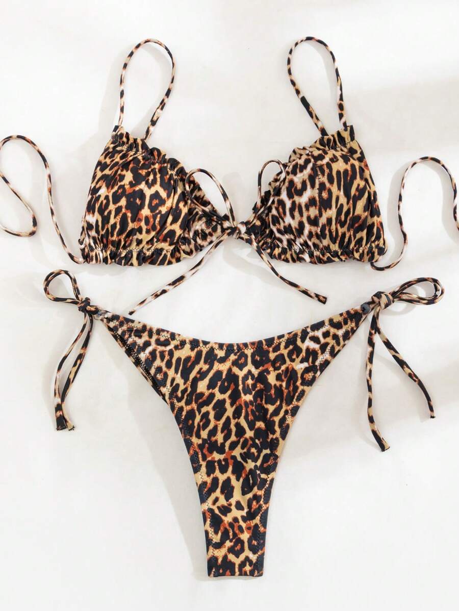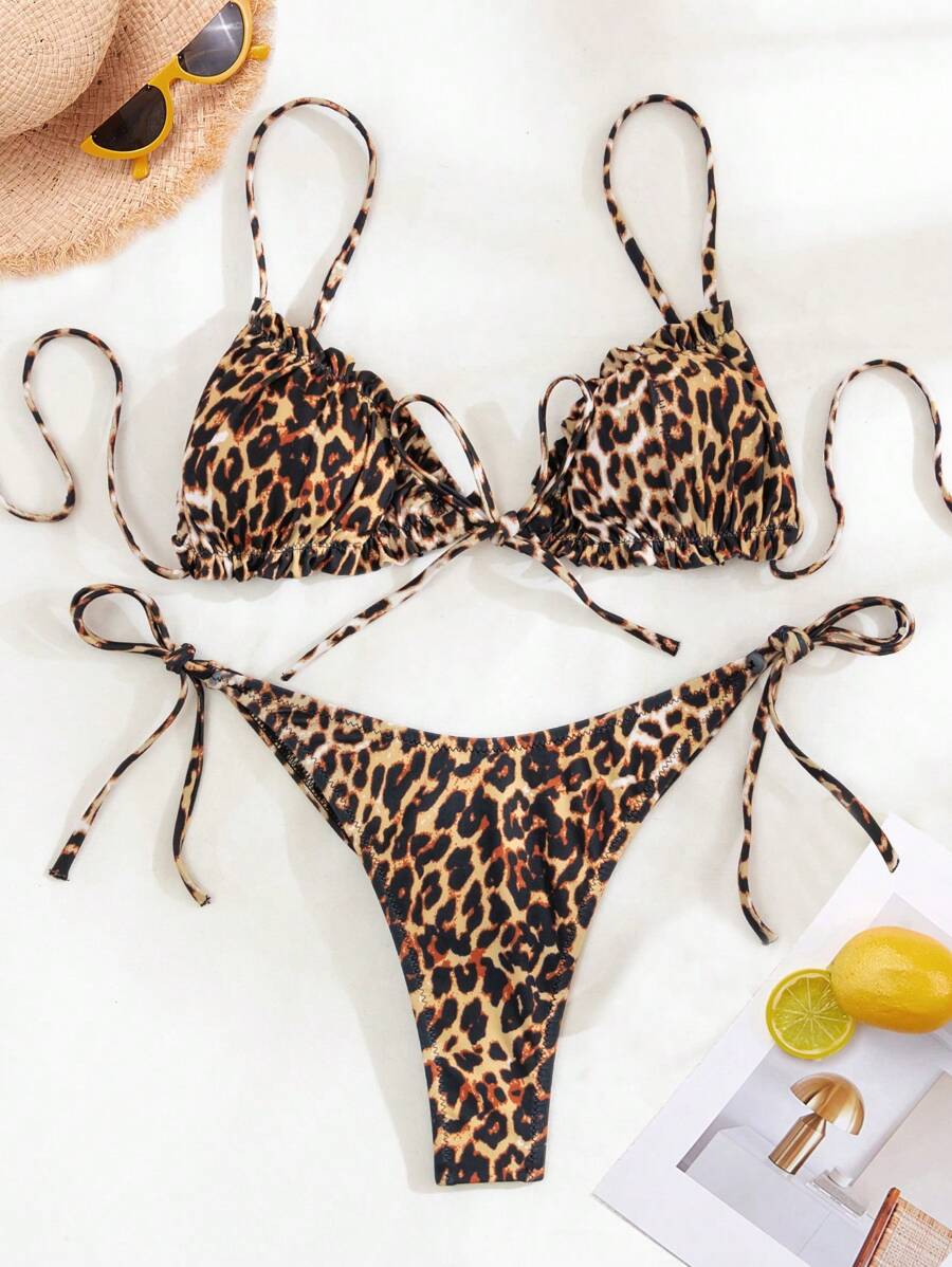 طقم بكيني بأربطة جانبية برسومات نمر شاطئ صيفي مجموعة بكيني ذات قصة مكونة من 2 قطع منها صدرية مثلثة مع تريم كشكش