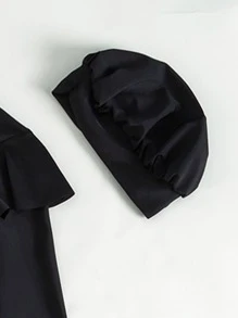 أحادية اللون تانكيني سباحة طقم كشكش أكمام طويلة تغطية كاملة فستان سباحة & طماق & قبعة 3قطعات ملابس سباحة