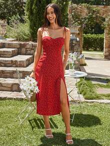 فستان أنيق بحزام مشقوق مزخرف بزهور صغيرة للصيف