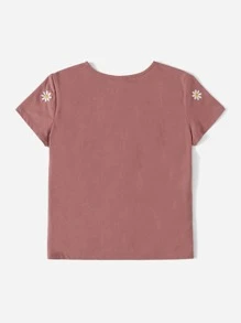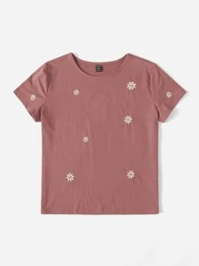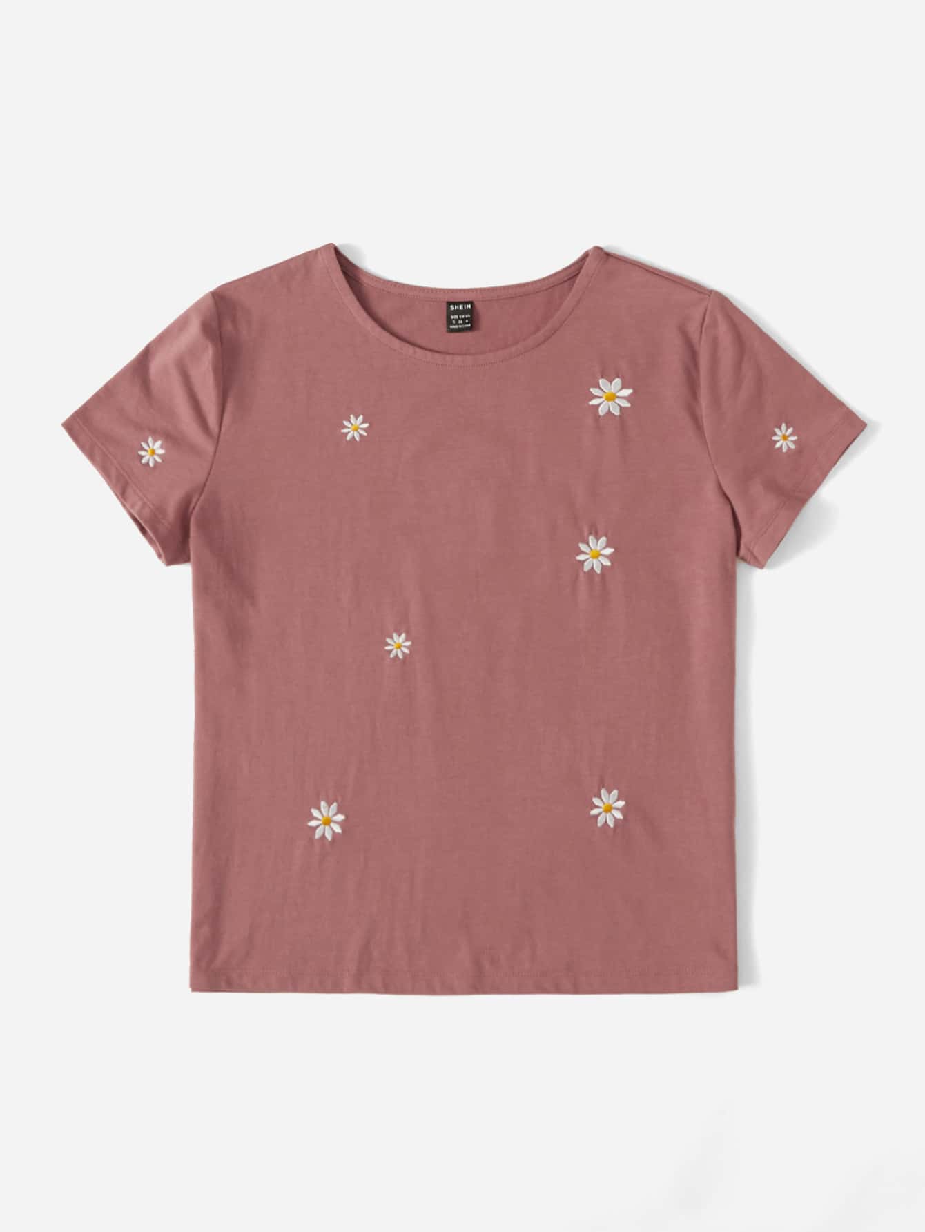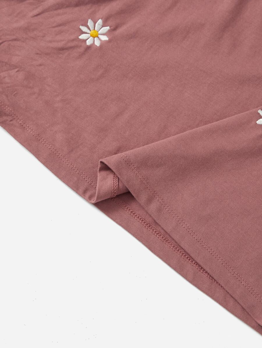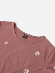 تي شيرت بأكمام قصيرة وردية بطبعات زهور تطريز البُنبُن الصيفي العارض المريح