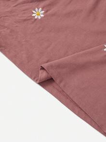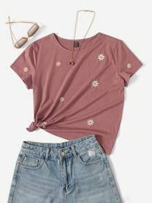 تي شيرت قصير أكمام وردي فضفاض وعادي مطرز بزهور الربيع الصيفية