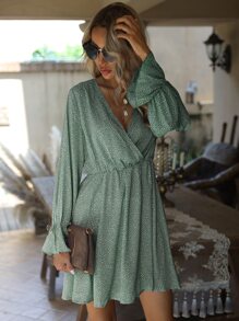فستان سوينغ بأكمام مكشكش وبعنق عميق متداخل