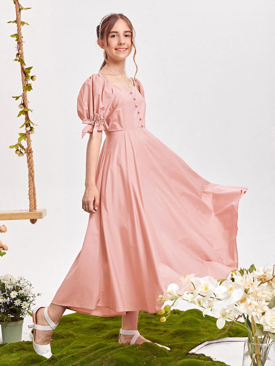 فستان بأكمام منفوخة وأزرار أمامية بتفاصيل ربطة فراشة بنت مراهقة