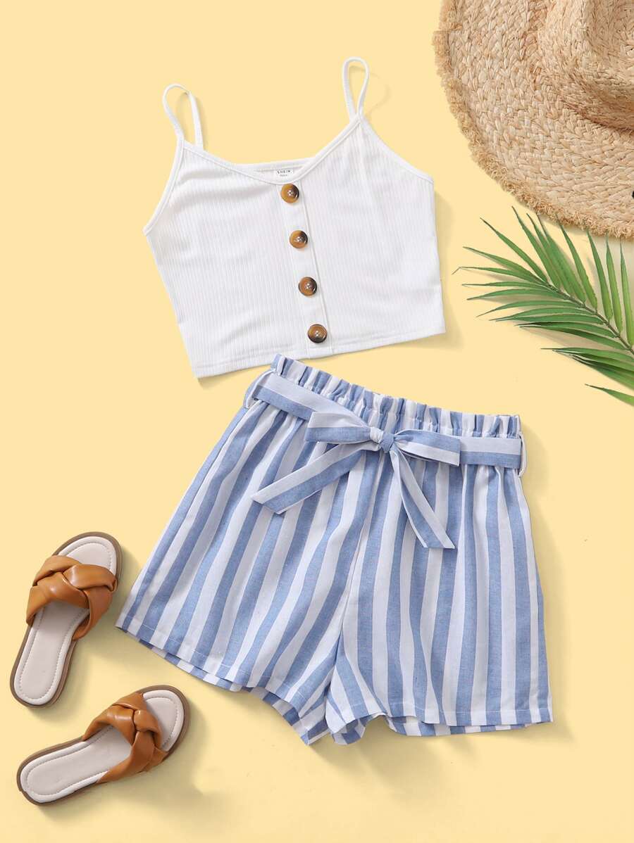 طقم شورت مخطط بحزام ذاتي مع لباس علوي كامي بأزرار امامي للفتيات المراهقات