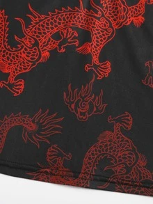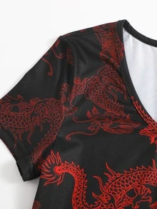 تي شيرت بعنق V بطباعة تنين صيني للبنات المراهقات