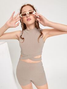 طقم شورت مع لباس علوي تانك بخصر وباربطة متقاطعة للفتيات المراهقات