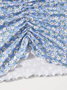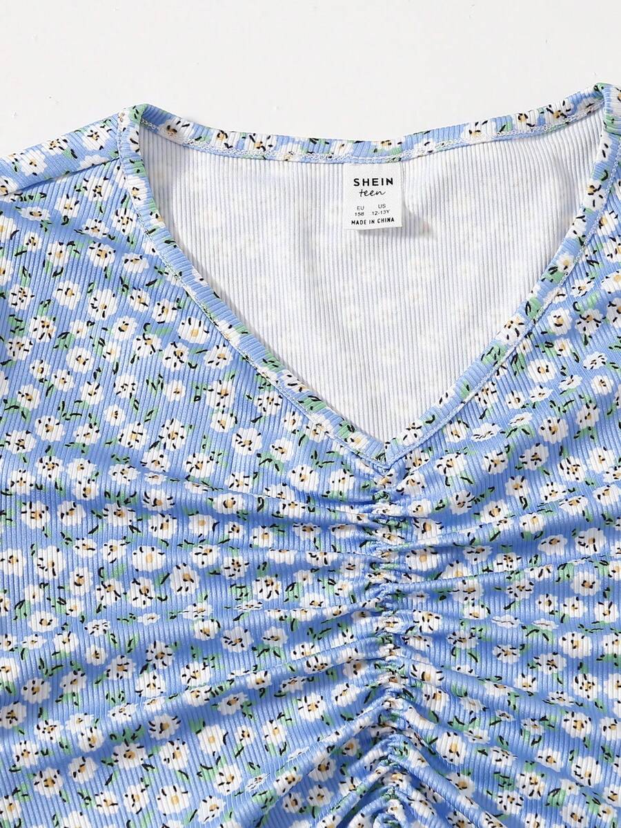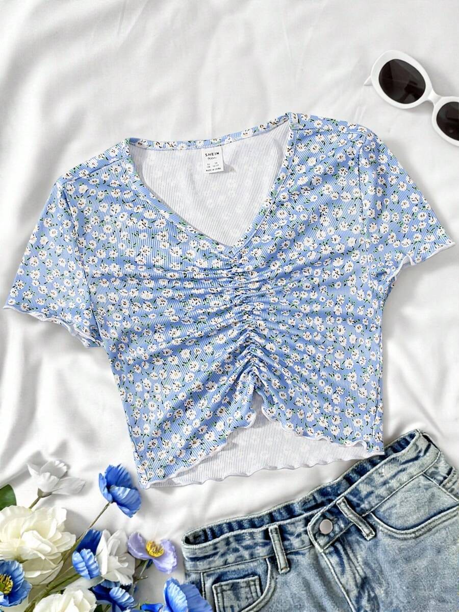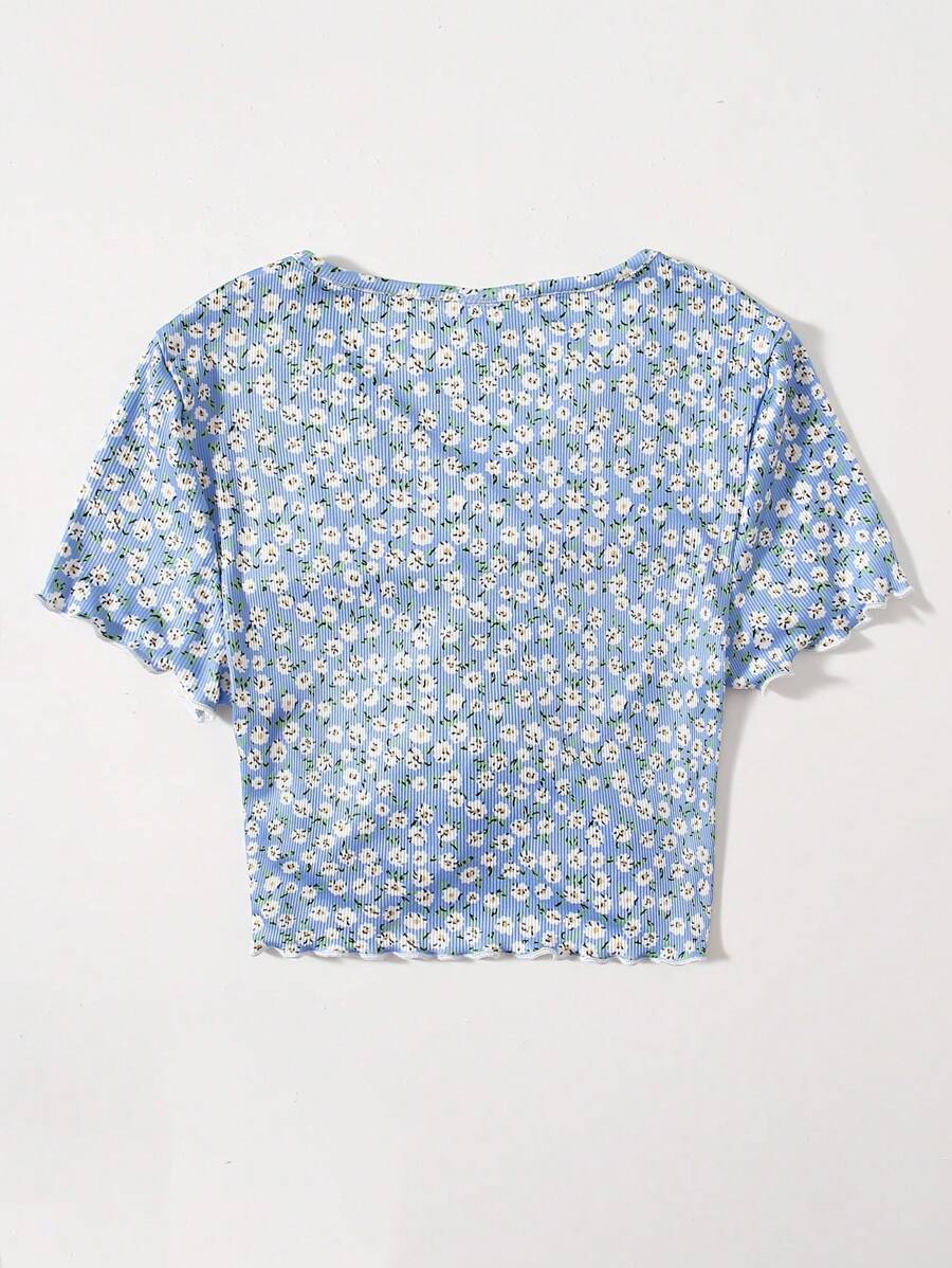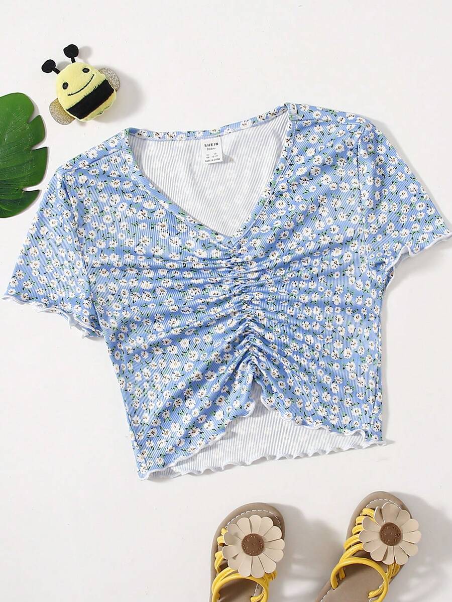 تي شيرت مكشكش مقلم نمط الخس بزهر اقحوان للبنات المراهقات