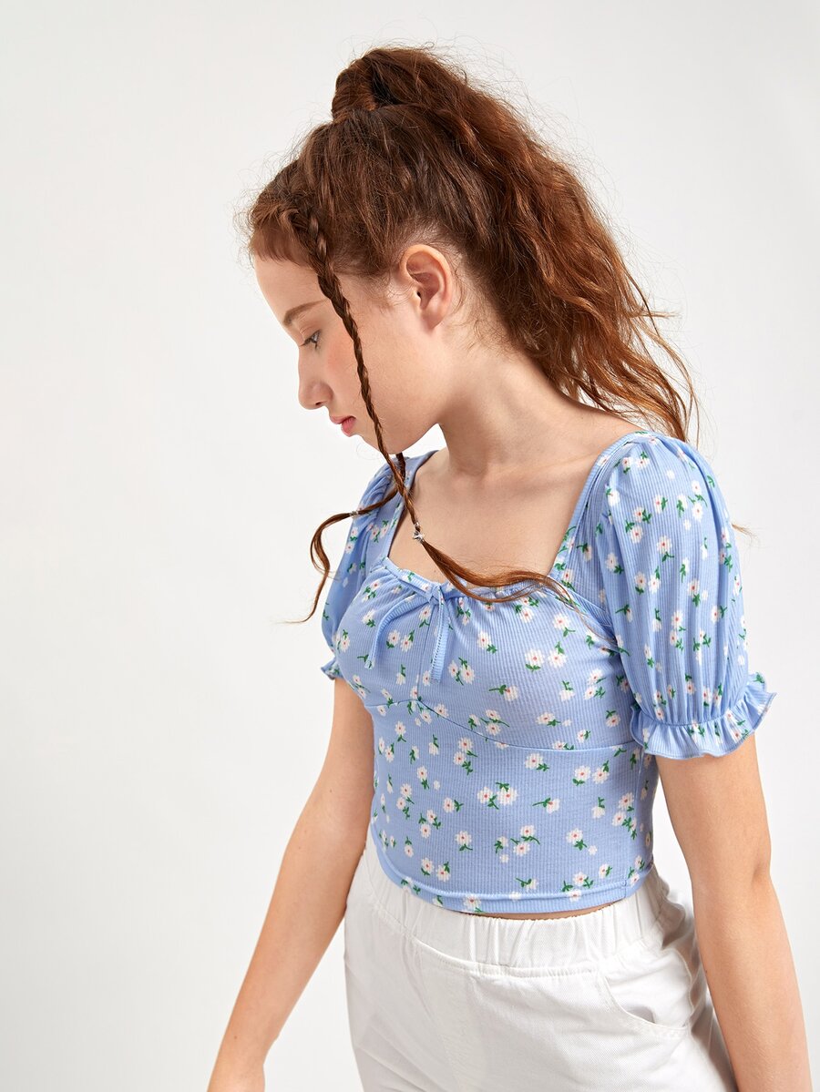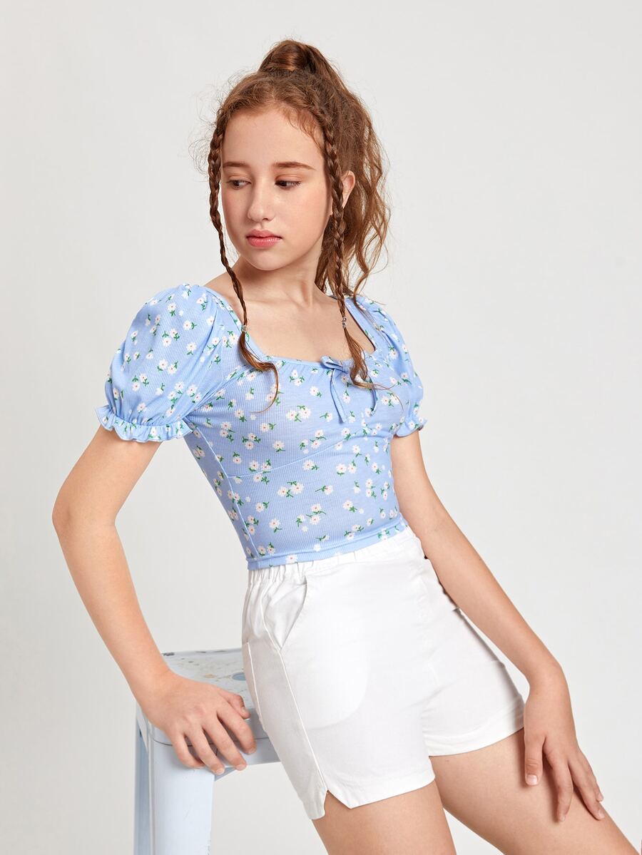 تي شيرت محبوك ومضلع بربطة امامي وبطباعة زهر اقحوان للفتيات المراهقات