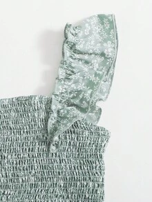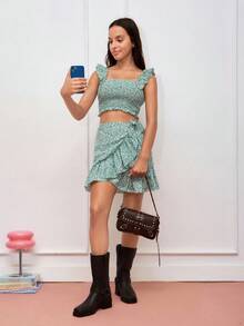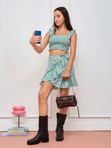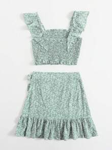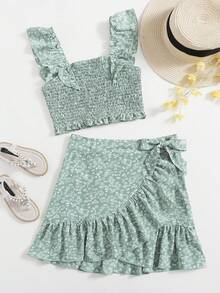 تنورة بعقدة مطوي مع لباس علوي قصير مدرز بكتف مكشكش بزهر اقحوان للفتيات المراهقات