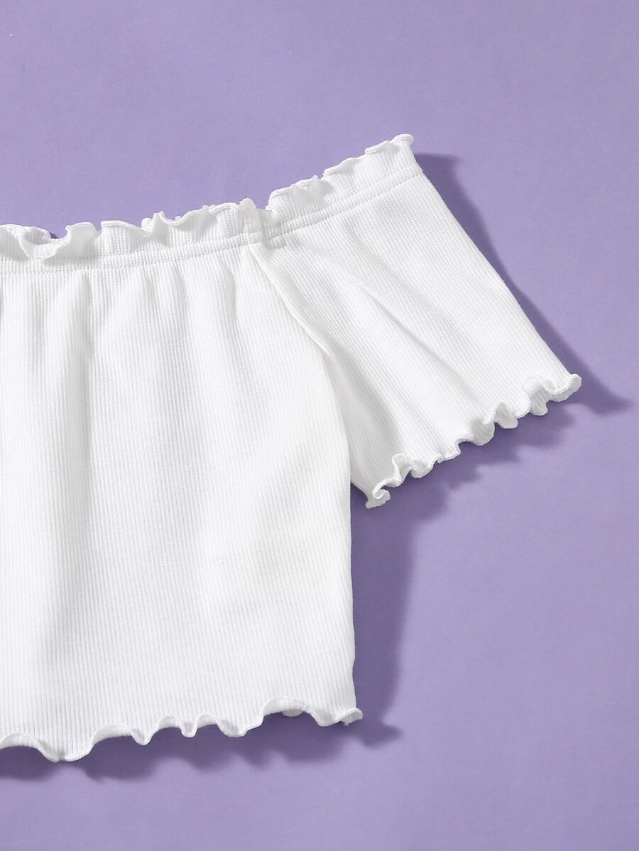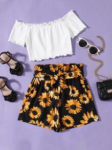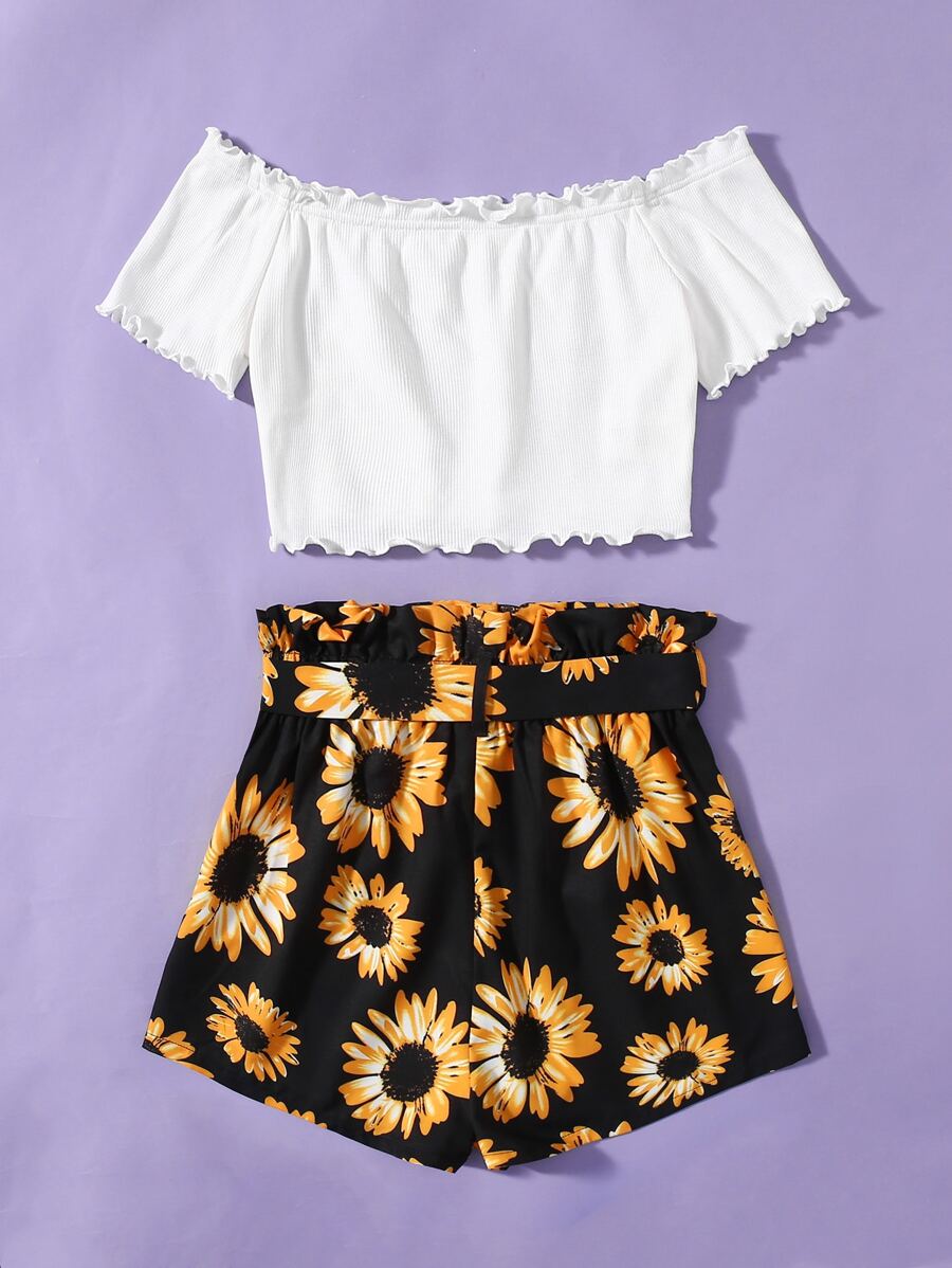 طقم شورت بحزام بخصر مكشكش ورقي مع لباس علوي مقلم نمط الخس مكشوف الكتف للبنات المراهقات