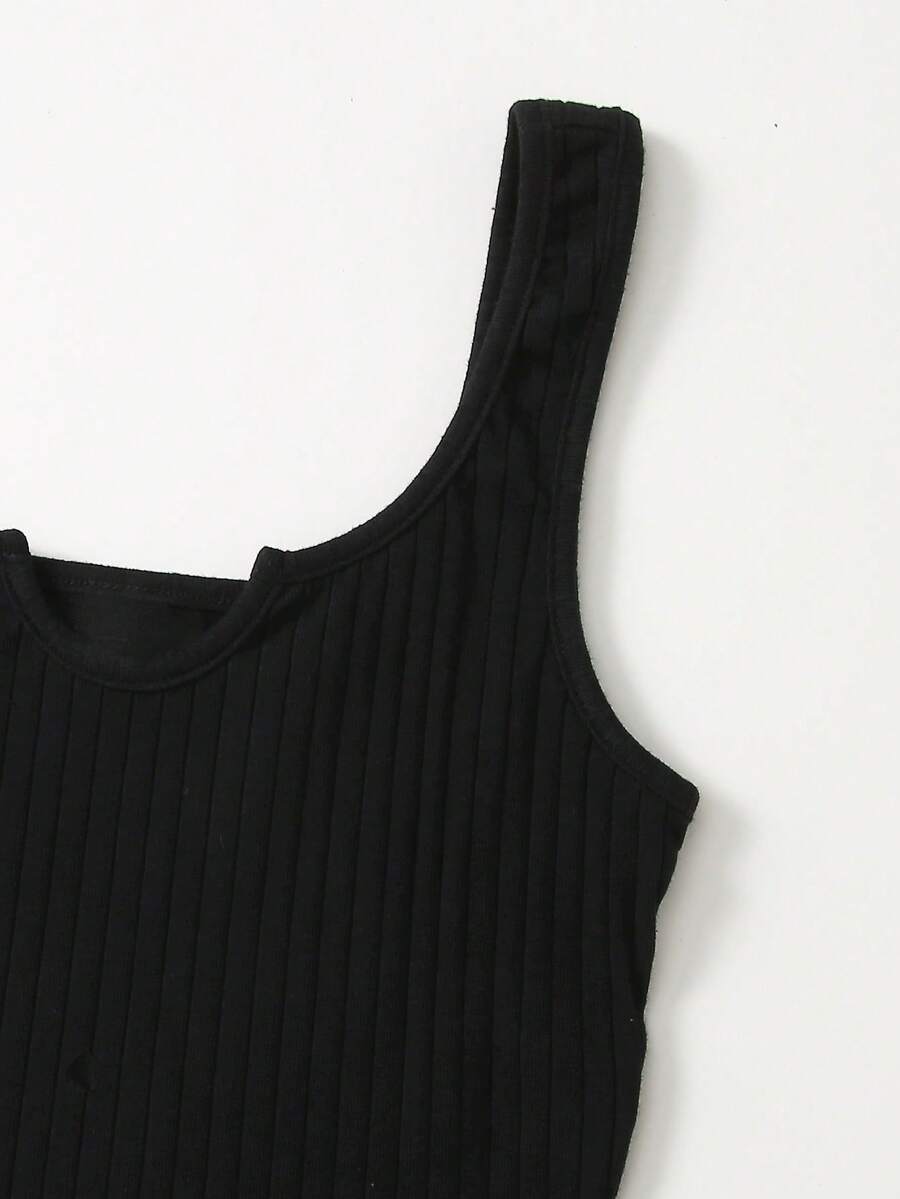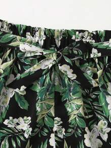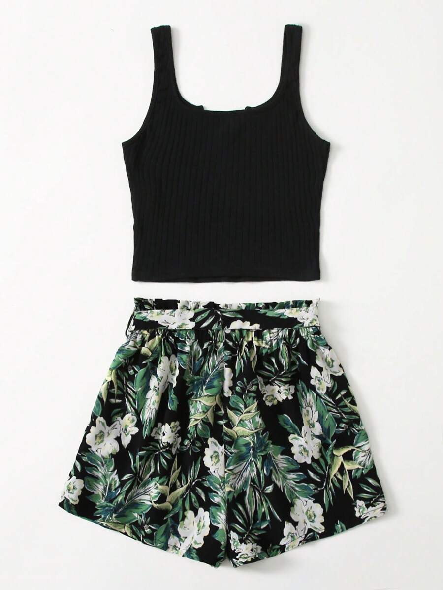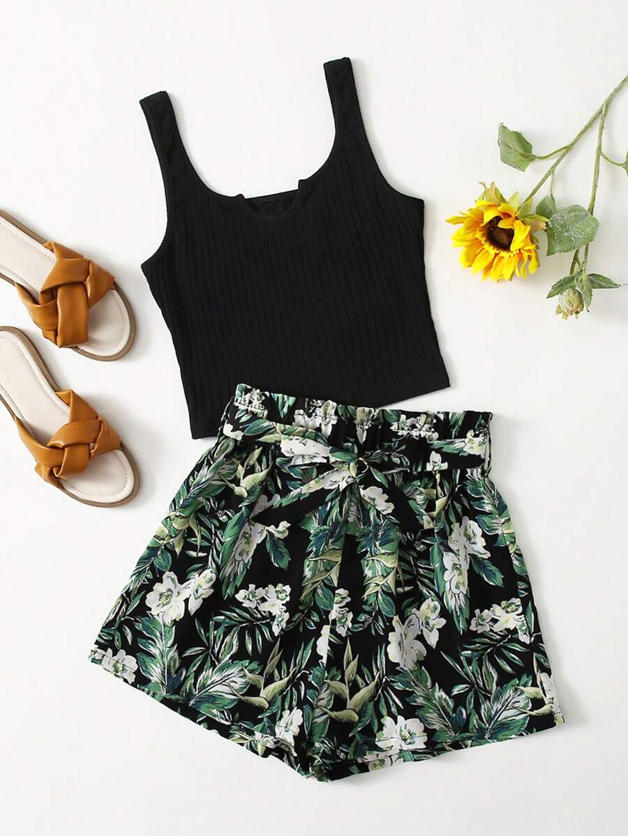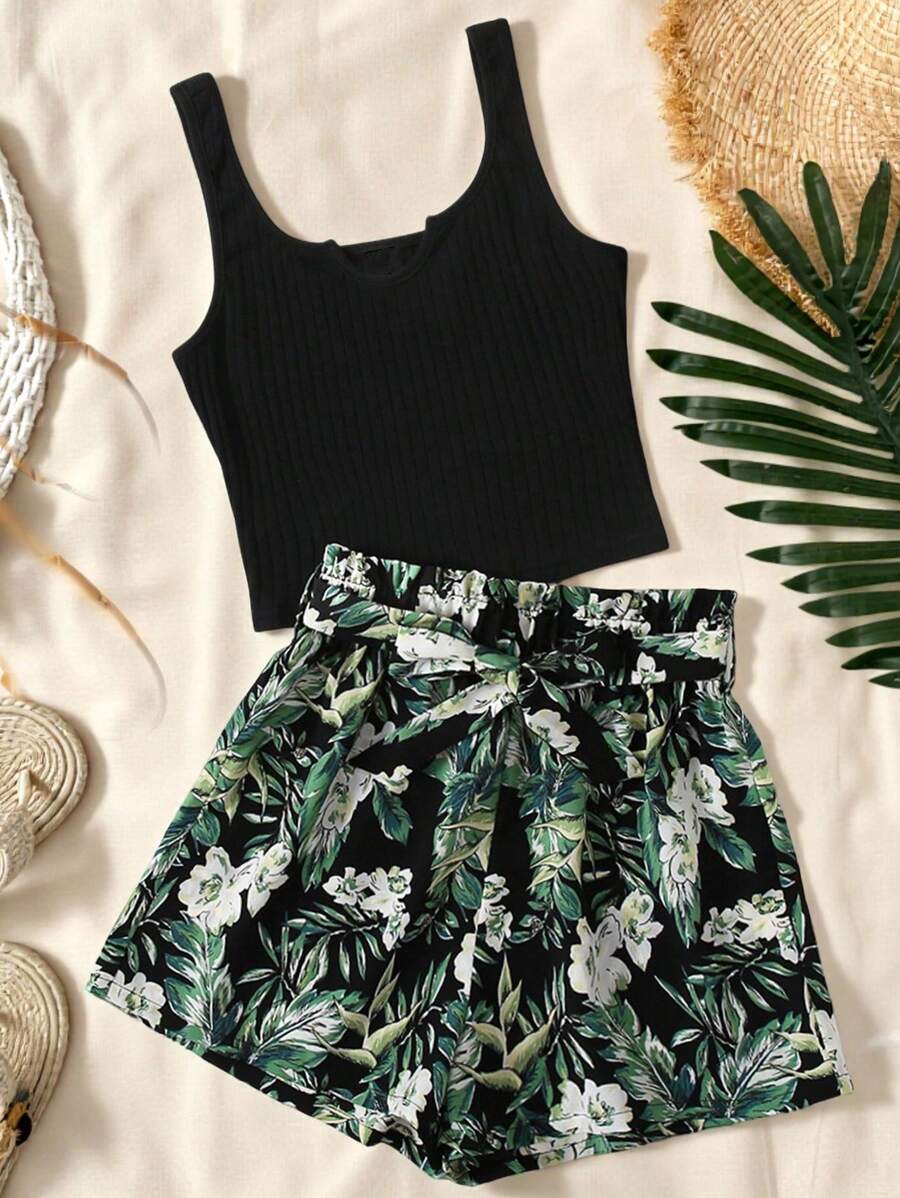 طقم شورت بطباعة استوائي مع لباس علوي تانك محبوك ومضلع للفتيات المراهقات