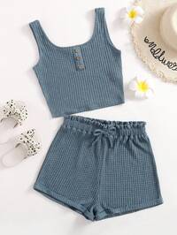 طقم شورت مع لباس علوي تانك بازرار امامي للبنات المراهقات