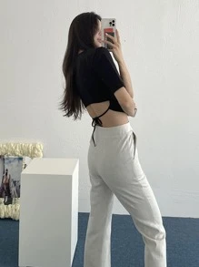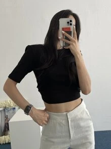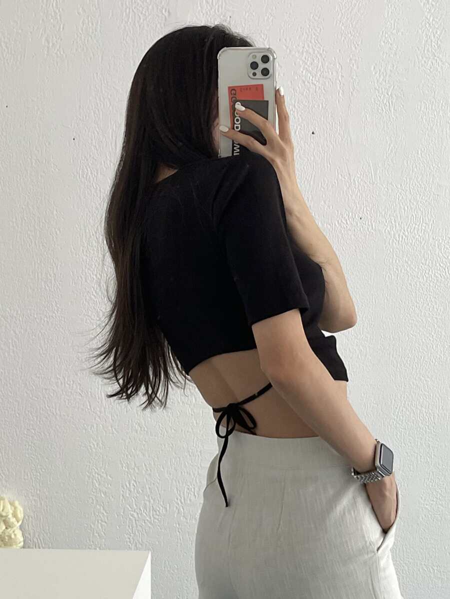 قميص نسائي بياقة ربطة مناسب للجسم، توب قصير