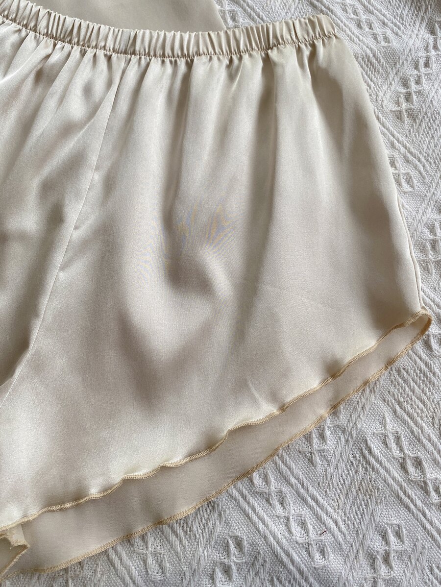 طقم بيجامة مكون من توب كامي من الساتان مع تريم من الخس على الأكتاف وشورت