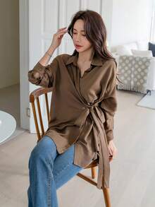 قميص كتف منسدل مع ربطة الجانب، ملابس علوية بأكمام طويلة، ملابس خريفية
