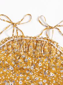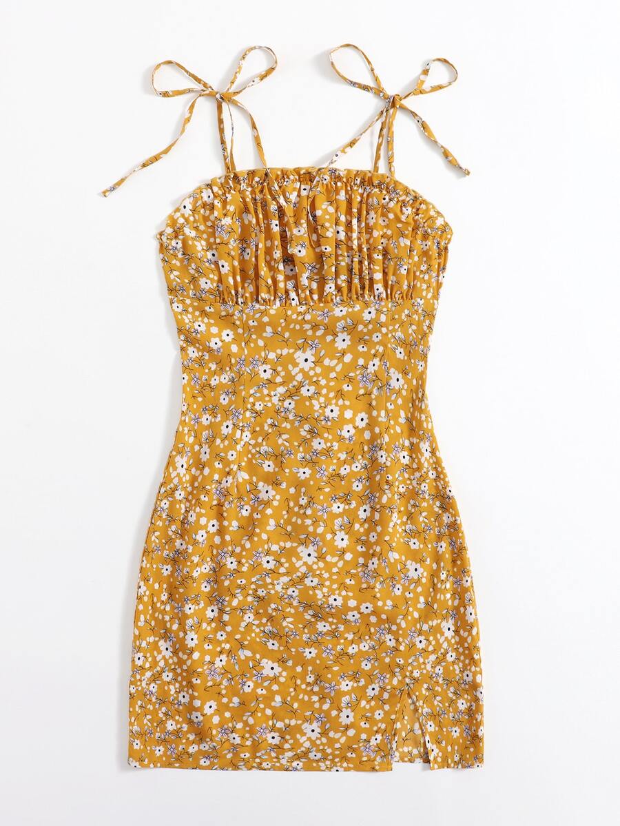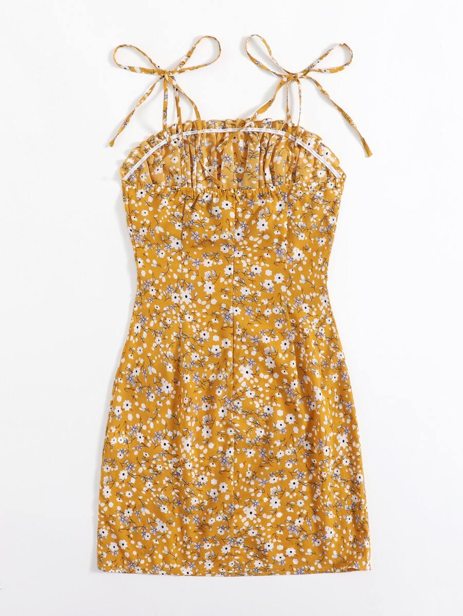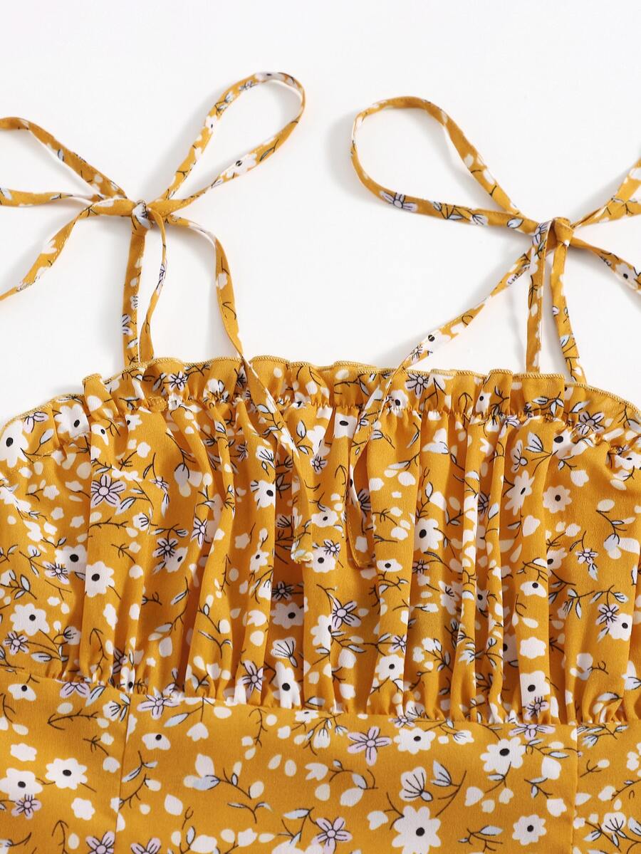 فستان بزهر اقحوان بحافة فتحة وبصدر مكشكش وبربطة كتف